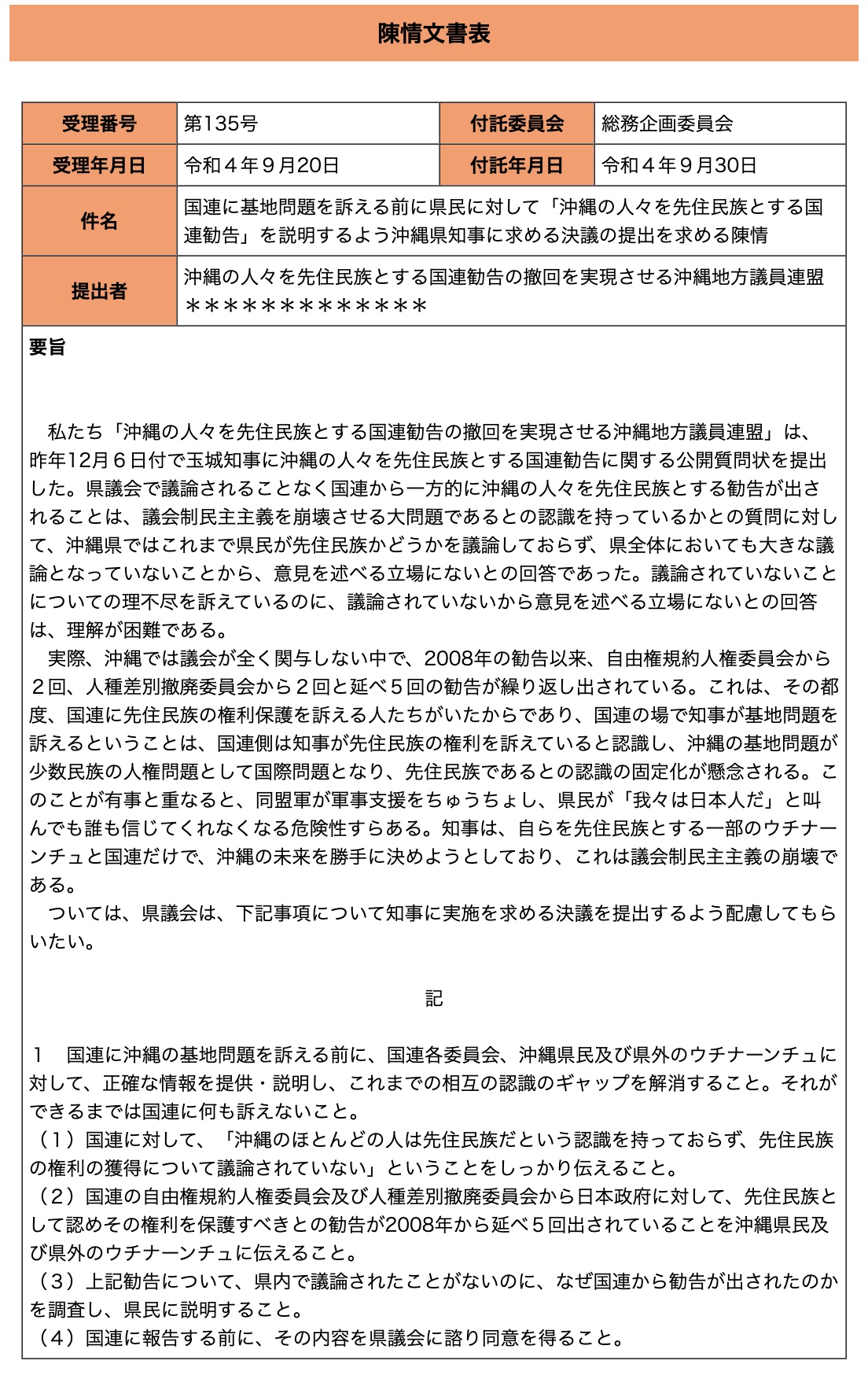 当議員連盟では、令和3年11月より、沖縄の人々を先住民族とする国連勧告に関して、沖縄県議会に陳情書を4通提出してきました。それは、知事が度々答弁しているように、沖縄県議会では1度も議論されたことが無いまま、国連の自由権規約委員会及び先住民族差別撤廃委員会にて、2008年より合計6回も沖縄の人々を先住民族とする勧告が出されているからです。本来ならこのような国連勧告は、広く県民の間でもその定義や意義について広く議論され、その結果として先住民速として認めてくれという陳情や請願が沖縄県議会に多数提出され、県議会で深く、審査、審議されたあと全会一致で可決され、その後、何度も政府に意見書や要請行動が続けられても政府が認めず、その結果、沖縄県からジュネーブの人権理事会や各人権関連機関や委員会に要請団を派遣した結果出されるべきものです。当議員連盟は、沖縄の人々が先住民族か日本人なのかという前にこのプロセスに大きな疑義と大きな危機感を持つものであり、このように県民も議会も議論に参加する機会も無く勧告が出されるという大事件に対して、県議会で問題意識も持つこと無く議論もしないということは、議会の存在意義が問われることだと認識しています。また、この国連勧告は、県民一人ひとりのアイデンティティーに関わるものであり人生をも左右するものです。是非ともこのような重大なことは、総務企画委員会及び本会議で議論してできれば委員会としての見解、それができなければ、会派ごとの見解をまとめて、県民にわかりやすく説明できるようお願い致します。それでこそ、県民もこの問題を認識し広く議論でき、本来の民主主義的なプロセスを取り戻すことができると認識しております。よって、以下要請いたします。