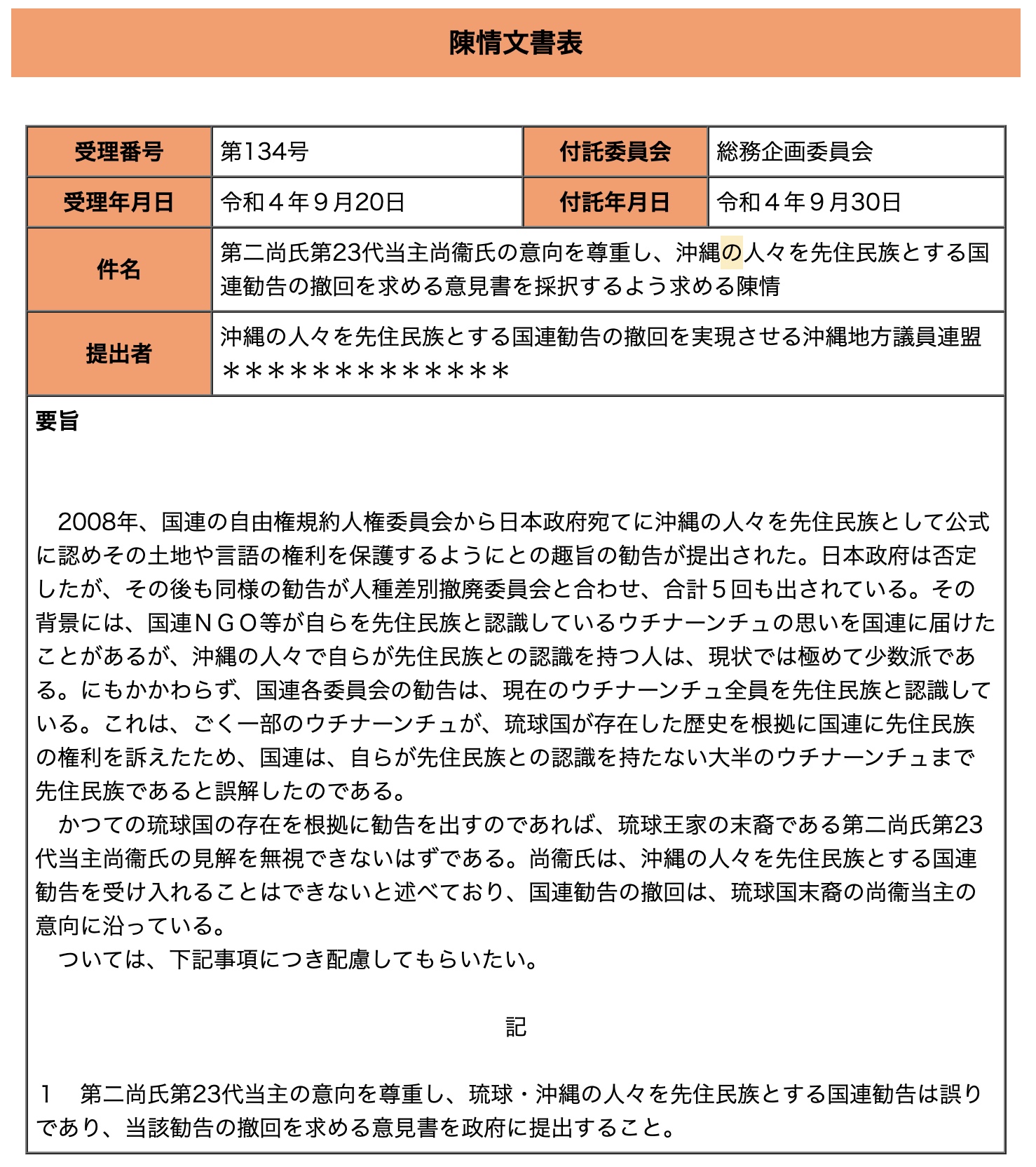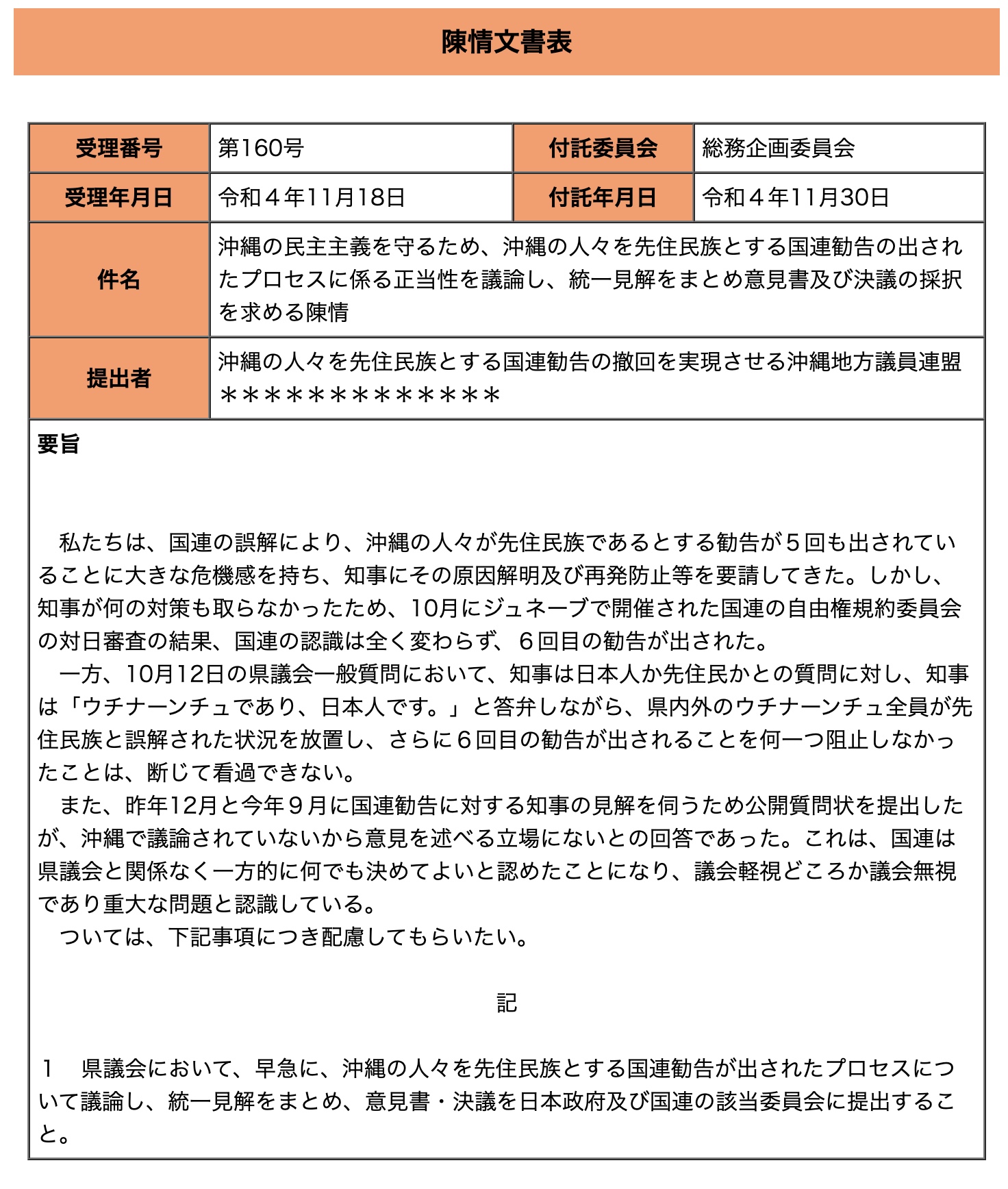 総務企画委員宛 陳情者団体:沖縄の人々を先住民族とする国連勧告の