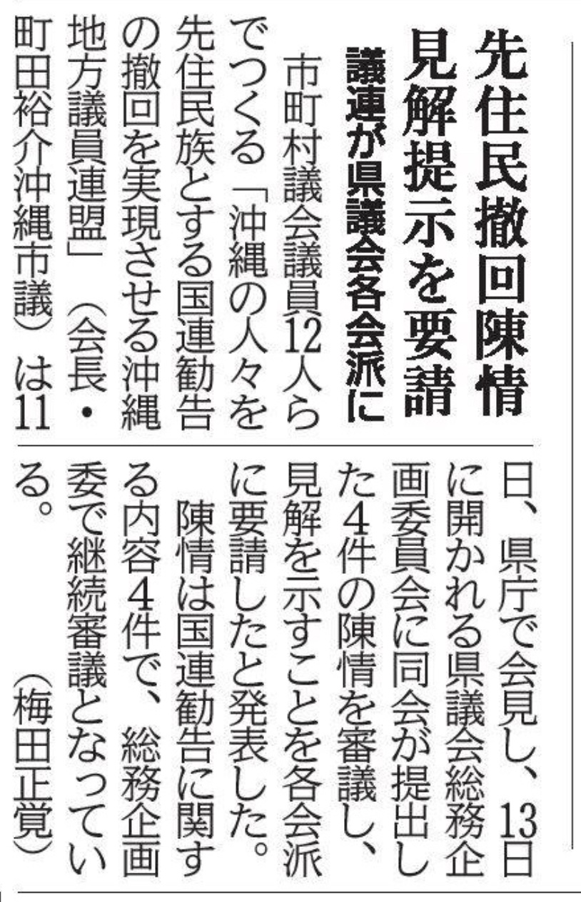 - 国連自由権規約委員会及び先住民族差別撤廃委員会からの沖縄の人々を先住民族とする勧告について、沖縄県議会総務企画委員会で重大な問題だと認識したうえで深く審議をお願い致します。