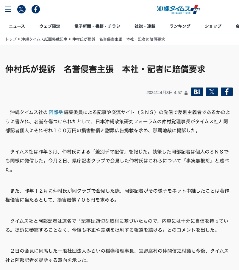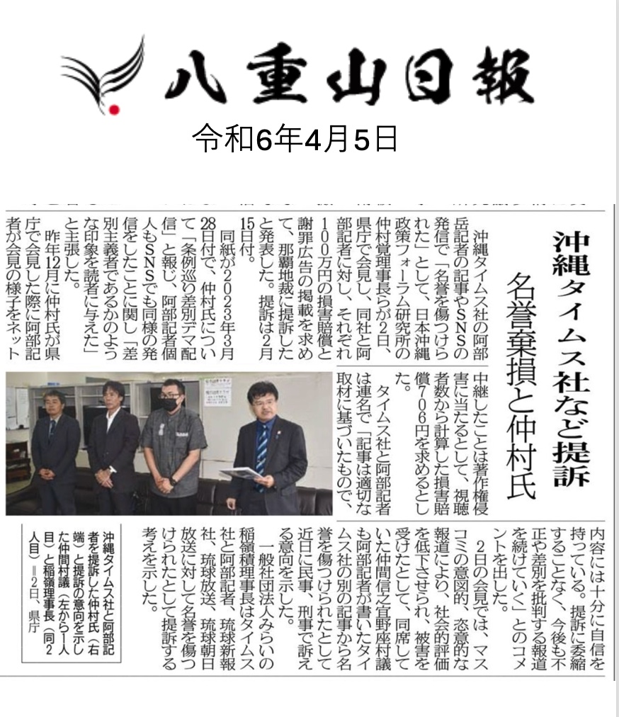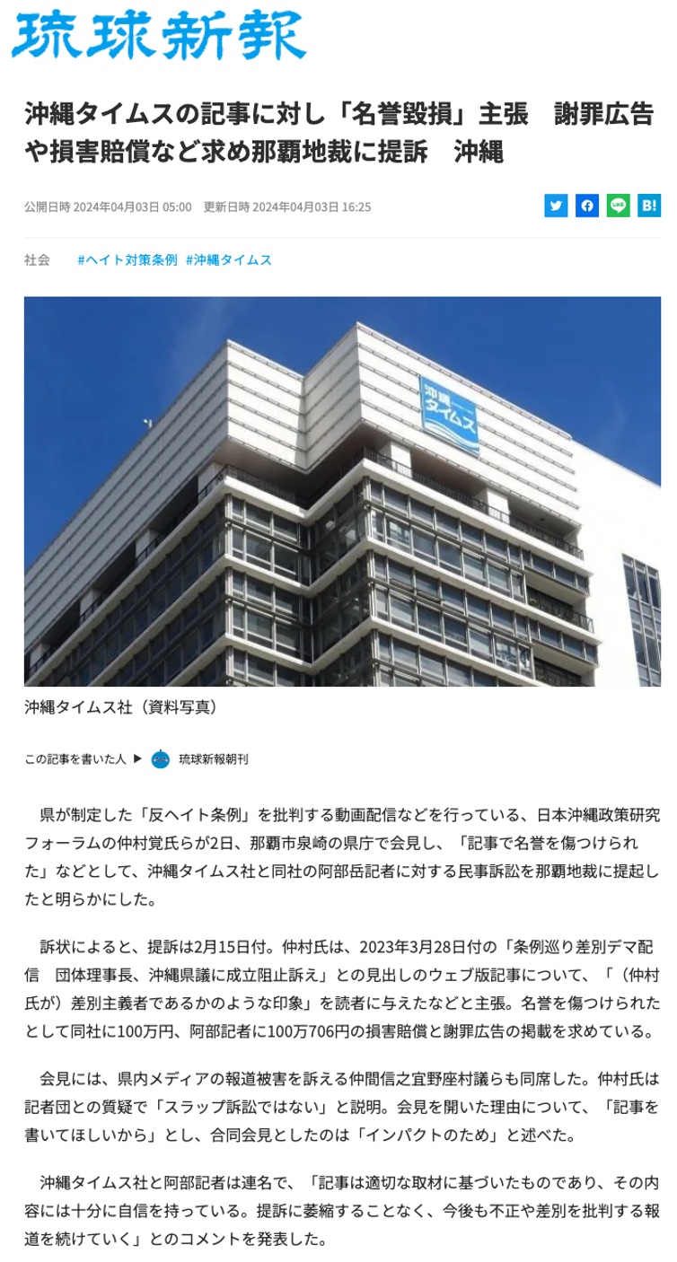 【報道一覧】沖縄タイムス名誉毀損訴訟 未分類 X Facebook はてブ Pocket LINE コピー 2024.04.07 この記事は約1分で読めます。 【報道一覧】沖縄タイムス名誉毀損訴訟 ■琉球新報 ■沖縄タイムス ■八重山日報 ■宮古新報 Views: 1,074