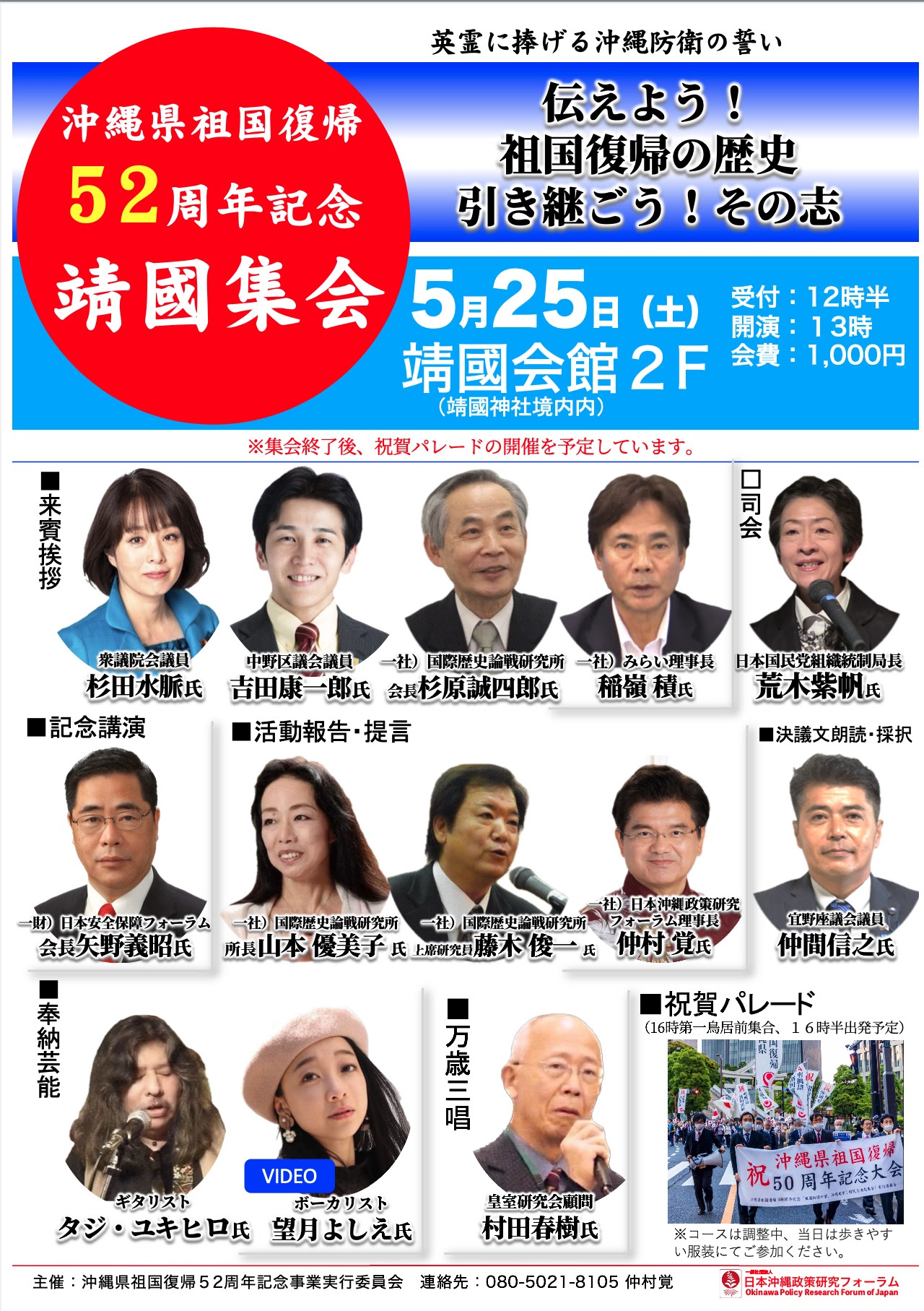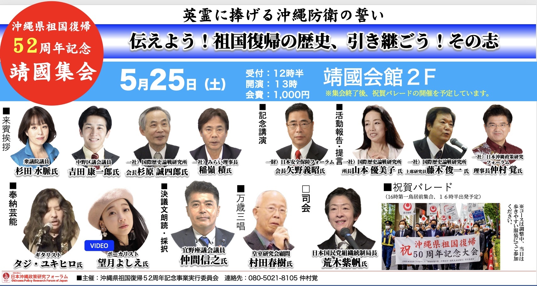 沖縄戦と沖縄県祖国復帰は誇りある日本の歴史です。沖縄県の祖国復帰を実現した5月15日という日は、沖縄戦を戦った英霊と沖縄祖国復帰にご尽力された全ての方に感謝を捧げるとともに、彼らの志をしっかりと引き継いで、「再び沖縄を他国に渡さない!」「必ず守り抜く!」ということを全ての日本国民で誓い合う日にしましょう!