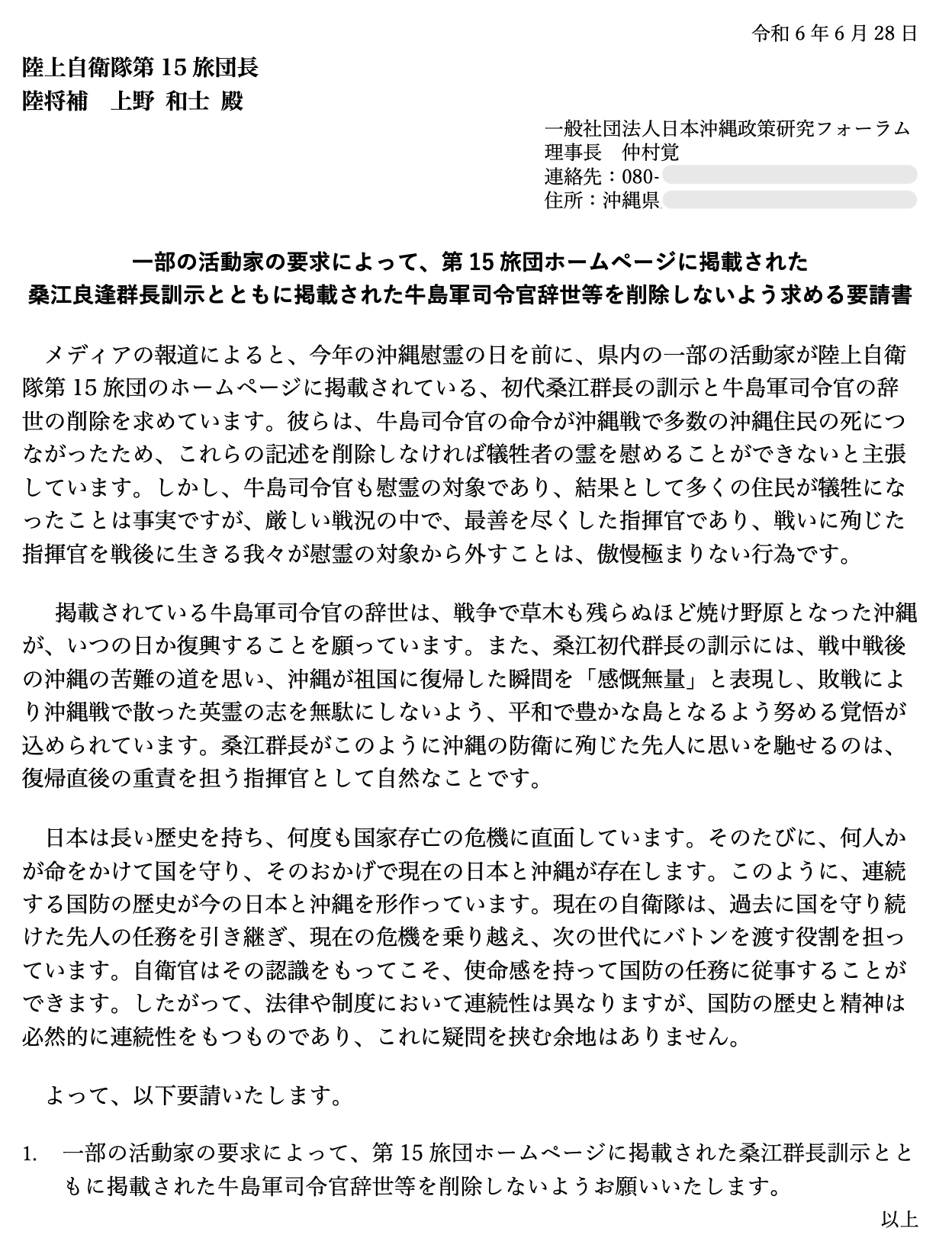 令和6年6月28日 陸上自衛隊第15旅団長 一般社団法人日本沖縄政策研究フォーラム 一部の活動家の要求によって、第15旅団ホームページに掲載された 桑江群長訓示とともに掲載された牛島軍司令官辞世等を削除しないよう求める要請書 メディアの報道によると、今年の沖縄慰霊の日を前に、県内の一部の活動家が陸上自衛隊第15旅団のホームページに掲載されている、初代桑江群長の訓示の最後に掲載された牛島軍司令官の辞世の削除を求めています。彼らは、牛島司令官の命令が沖縄戦で多数の沖縄住民の死につながったため、これらの記述を削除しなければ犠牲者の霊を慰めることができないと主張しています。しかし、牛島司令官も慰霊の対象であり、結果として多くの住民が犠牲になったことは事実ですが、厳しい戦況の中で、最善を尽くした指揮官であり、戦いに殉じた指揮官を戦後に生きる我々が慰霊の対象から外すことは、傲慢極まりない行為です。 15旅団のホームページに掲載されている牛島軍司令官の辞世は、戦争で草木も残らぬほど焼け野原となった沖縄が、いつの日か復興することを願っています。また、桑江初代群長の訓示には、戦中戦後の沖縄の苦難の道を思い、沖縄が祖国に復帰した瞬間を「感慨無量」と表現し、敗戦により沖縄戦で散った英霊の志を無駄にしないよう、平和で豊かな島となるよう努める覚悟が込められています。桑江群長が沖縄防衛の任務に就く際、その先人に思いを馳せるのは、復帰直後の沖縄防衛の重責を担う指揮官として自然なことです。 日本は世界一長い歴史を持つ国であり、その間、幾度か国家存亡の危機に直面しています。そのたびに、何人かが命をかけて国を守り、そのおかげで現在の日本と沖縄が存在します。このように、連続する国防の歴史が今の日本と沖縄を形作っています。現在の自衛隊は、過去に国を守り続けた先人の任務を引き継ぎ、現在の危機を乗り越え、次の世代にバトンを渡す役割を担っています。自衛官はその認識をもってこそ、使命感を持って国防の任務に従事することができます。したがって、法律や制度において連続性は異なりますが、国防の歴史と精神は必然的に連続性をもつものであり、これに疑問を挟む余地はありません。よって、以下要請いたします。 1、一部の活動家の要求によって、第15旅団ホームページに掲載された桑江群長訓示とともに掲載された牛島軍司令官辞世等を削除しないようお願いいたします。 以上