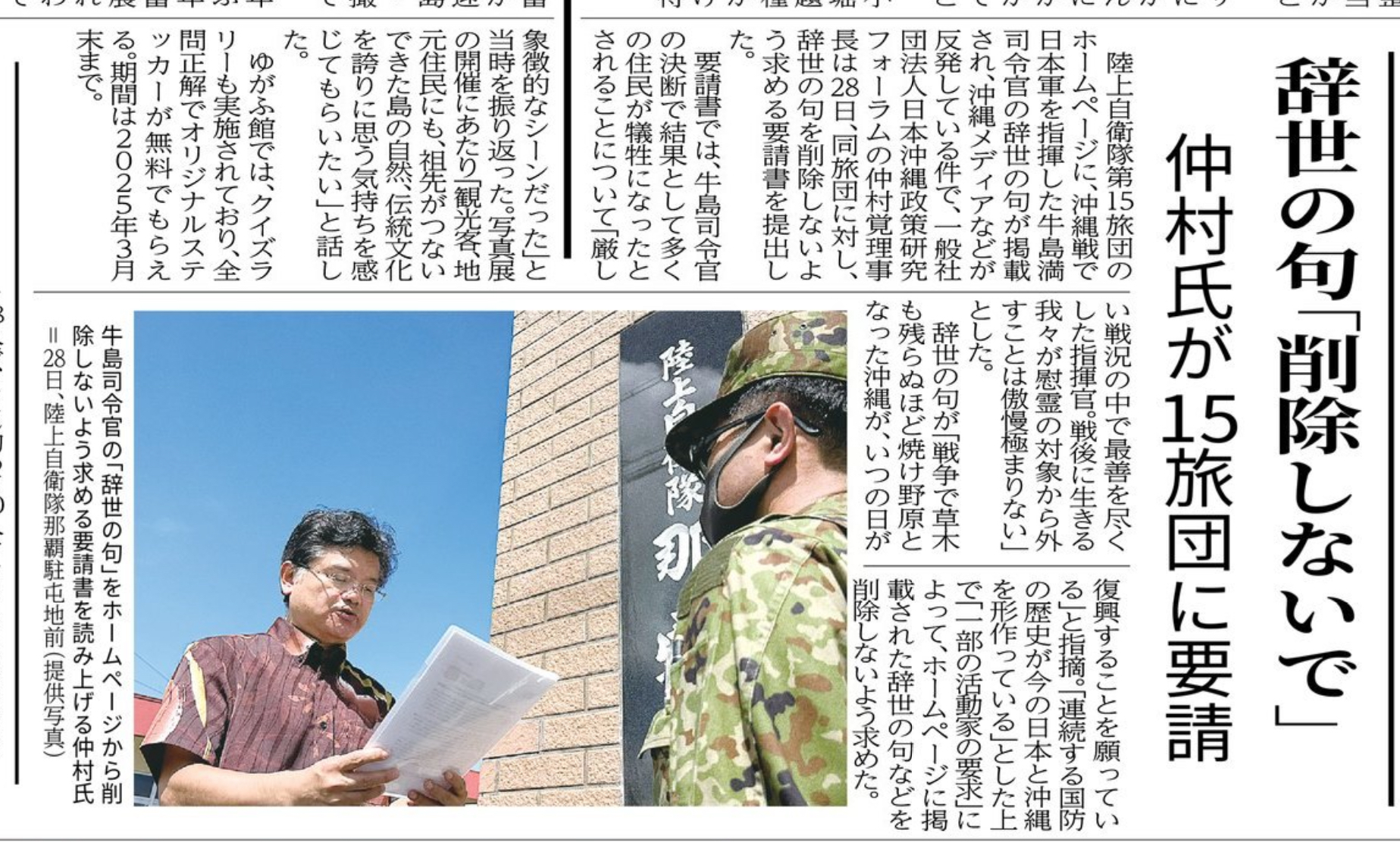 ■琉球新報:牛島司令官「辞世の句」削除の要請相次ぐ 県内の平和団体ら那覇駐屯地を訪れ 沖縄https://ryukyushimpo.jp/news/national/entry-3217404.html |
