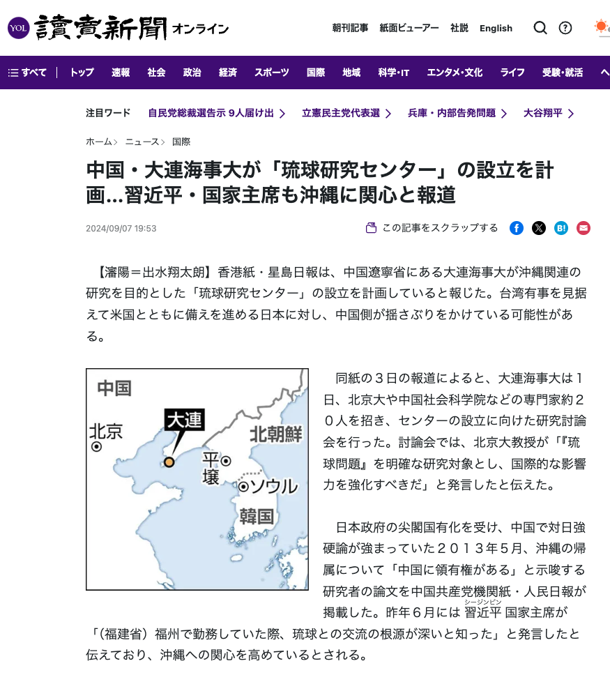 同紙の3日の報道によると、大連海事大は1日、北京大や中国社会科学院などの専門家約20人を招き、センターの設立に向けた研究討論会を行った。討論会では、北京大教授が「『琉球問題』を明確な研究対象とし、国際的な影響力を強化すべきだ」と発言したと伝えた。