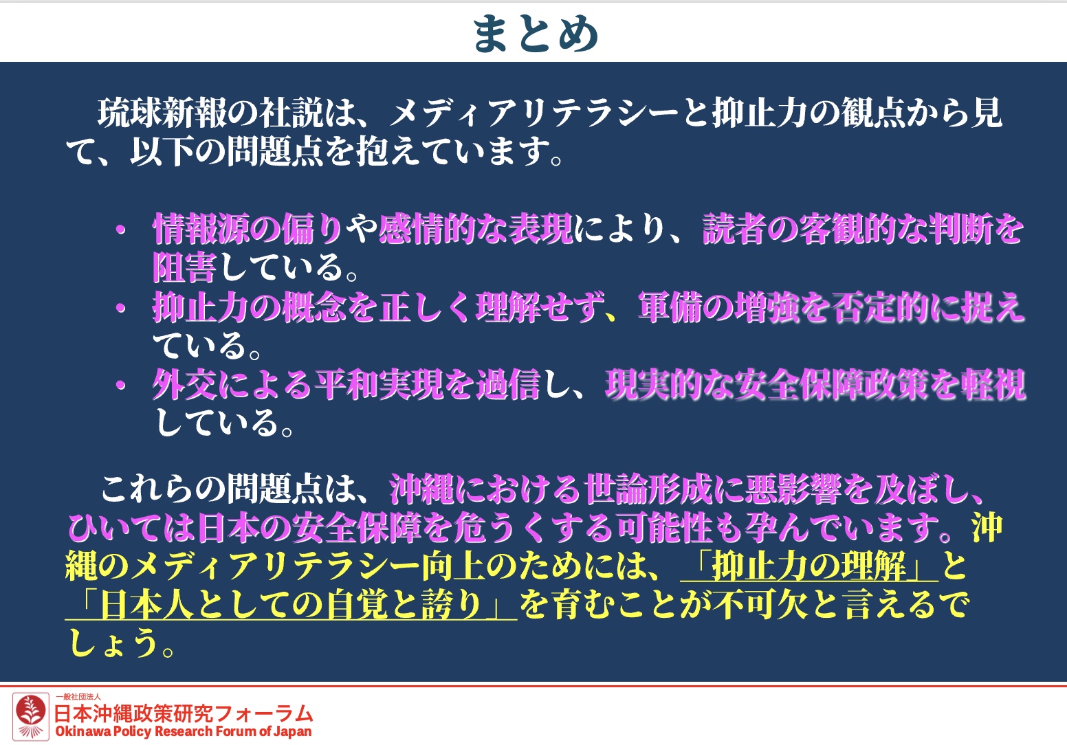 ③まとめ琉球新報の社説は、メディアリテラシーと抑止力の観点から見て、以下の問題点を抱えています。
