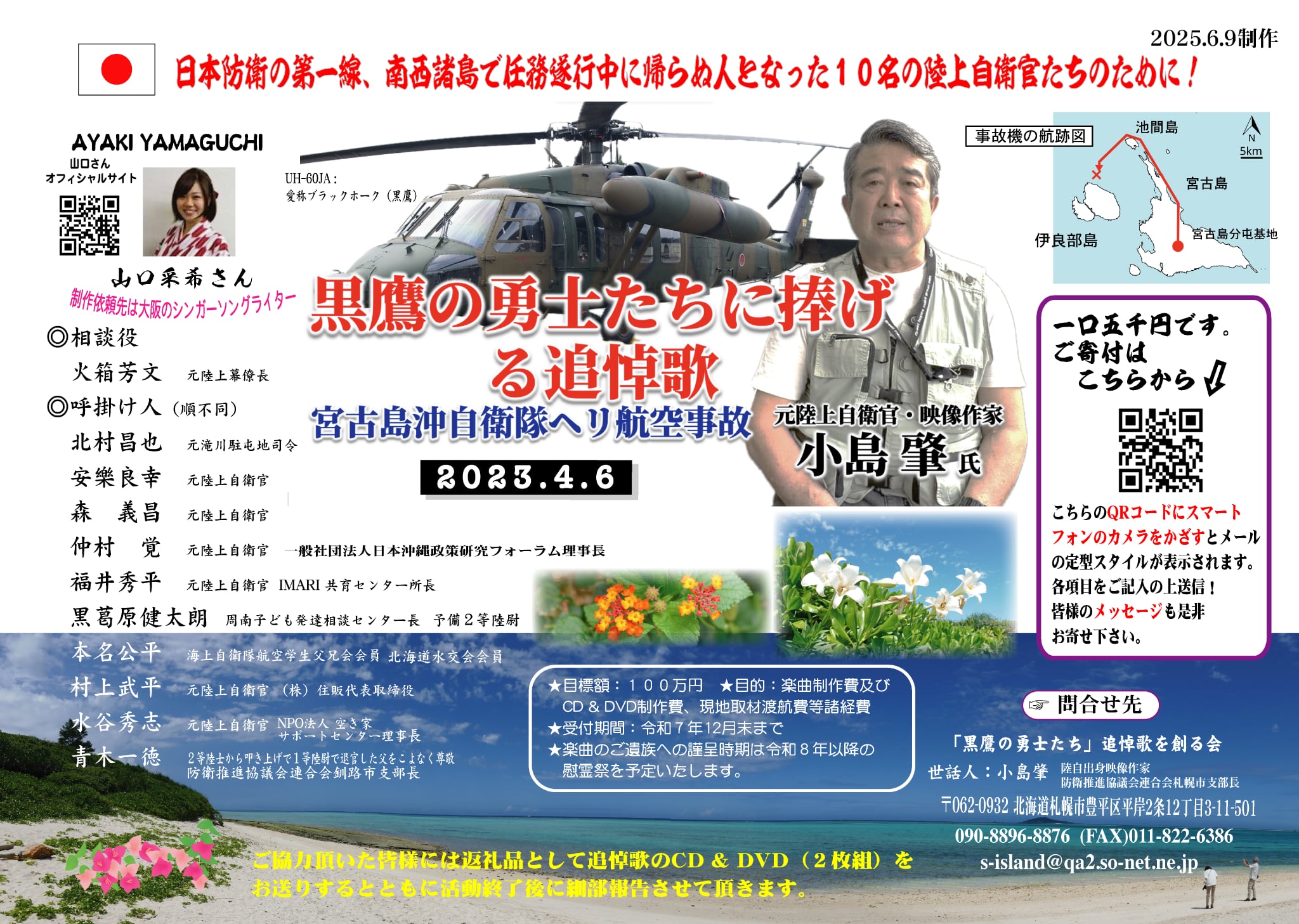 黒鷹の勇士たちに捧げる追悼歌 〜宮古島沖自衛隊ヘリ航空事故〜 自衛隊 X Facebook はてブ Pocket LINE コピー 2025.06.09 この記事は約1分で読めます。 黒鷹の勇士たちに捧げる追悼歌〜宮古島沖自衛隊ヘリ航空事故〜 寄付の振込先 ①ゆうちょ銀行 店番:908 記号:19060 番号:06407621 ②北洋銀行平岸中央支店(普通口座)4125310 ハジメビジョン Views: 491