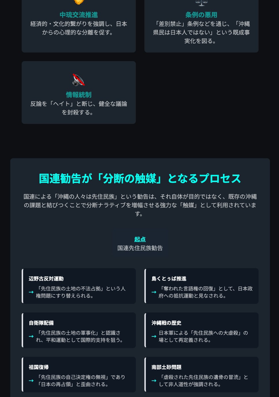 • 特に、沖縄戦において日本軍が琉球人に対して「大虐殺」を行ったという主張を含めることで、日本の統治の正当性を揺るがし、琉球独立の「大義」を国際的に訴える根拠とする。