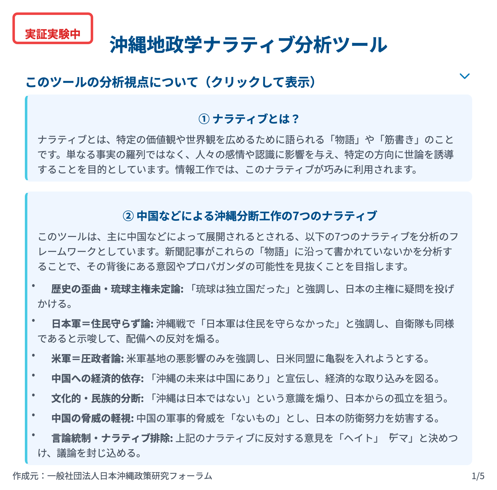 この記事は、日本の自衛隊を沖縄の地元住民に対して対立的で欺瞞的であると描写しており、日本の軍事プレゼンスに対する不信感を煽るナラティブに寄与しています。権力濫用と市民の抗議活動を抑圧しようとする試みを強調することで、沖縄内の広範な反軍事感情を助長し、ひいては本土の防衛政策からのより大きな自治や分離を求めるナラティブを間接的に支持するものです。これは、日本軍が地元住民の味方ではないという描写と一致します。