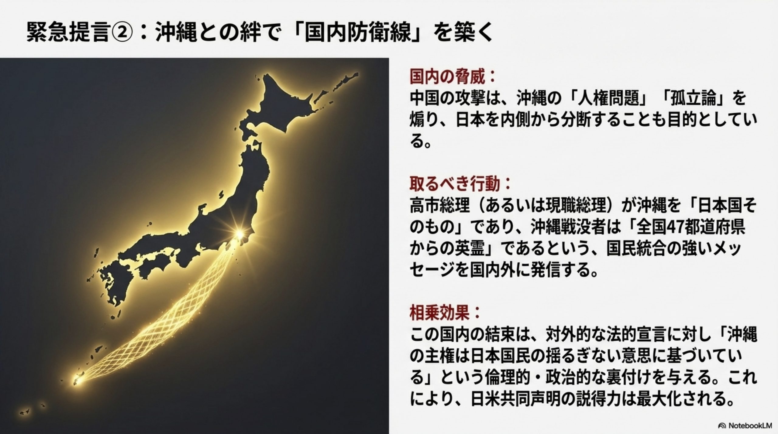 - 国内のカウンターロジック: 高市総理の沖縄訪問時(【提言書】III.B. 参照)を活用し、沖縄戦没者を「全国47都道府県からの英霊」と位置づけ、沖縄を「日本国そのもの」という国民統合の絆として再構築するメッセージを発信すべきです。