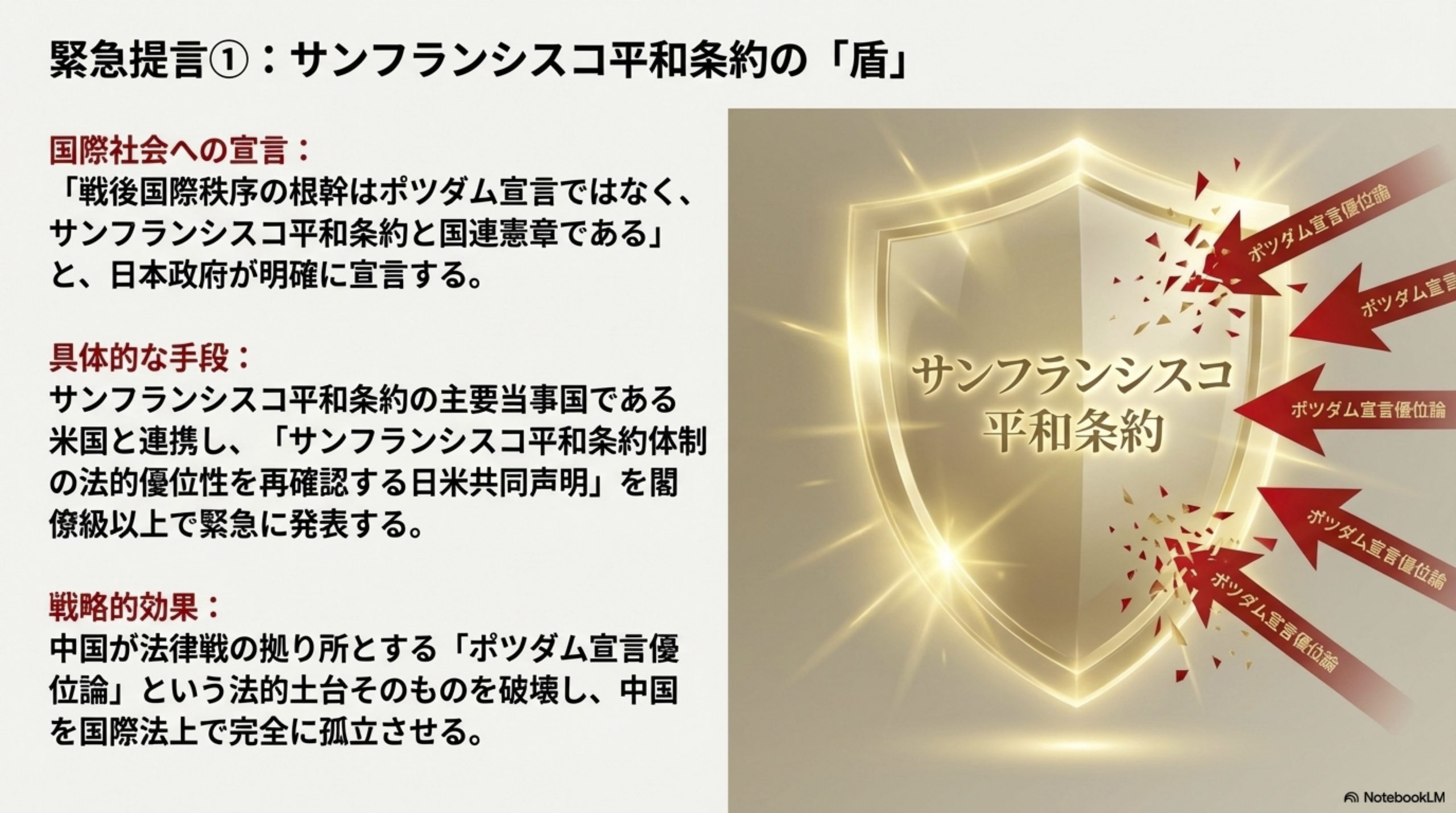 - 提言の具体化: サンフランシスコ平和条約の主要当事国である米国と連携し、「日米共同でサンフランシスコ平和助役体制の法的優位性を再確認する閣僚級以上の共同声明」を緊急に発表すべきです。この行動は、中国の「ポツダム宣言優位論」を国際法上孤立させ、複合法律戦の法的土台を根本から破壊します。