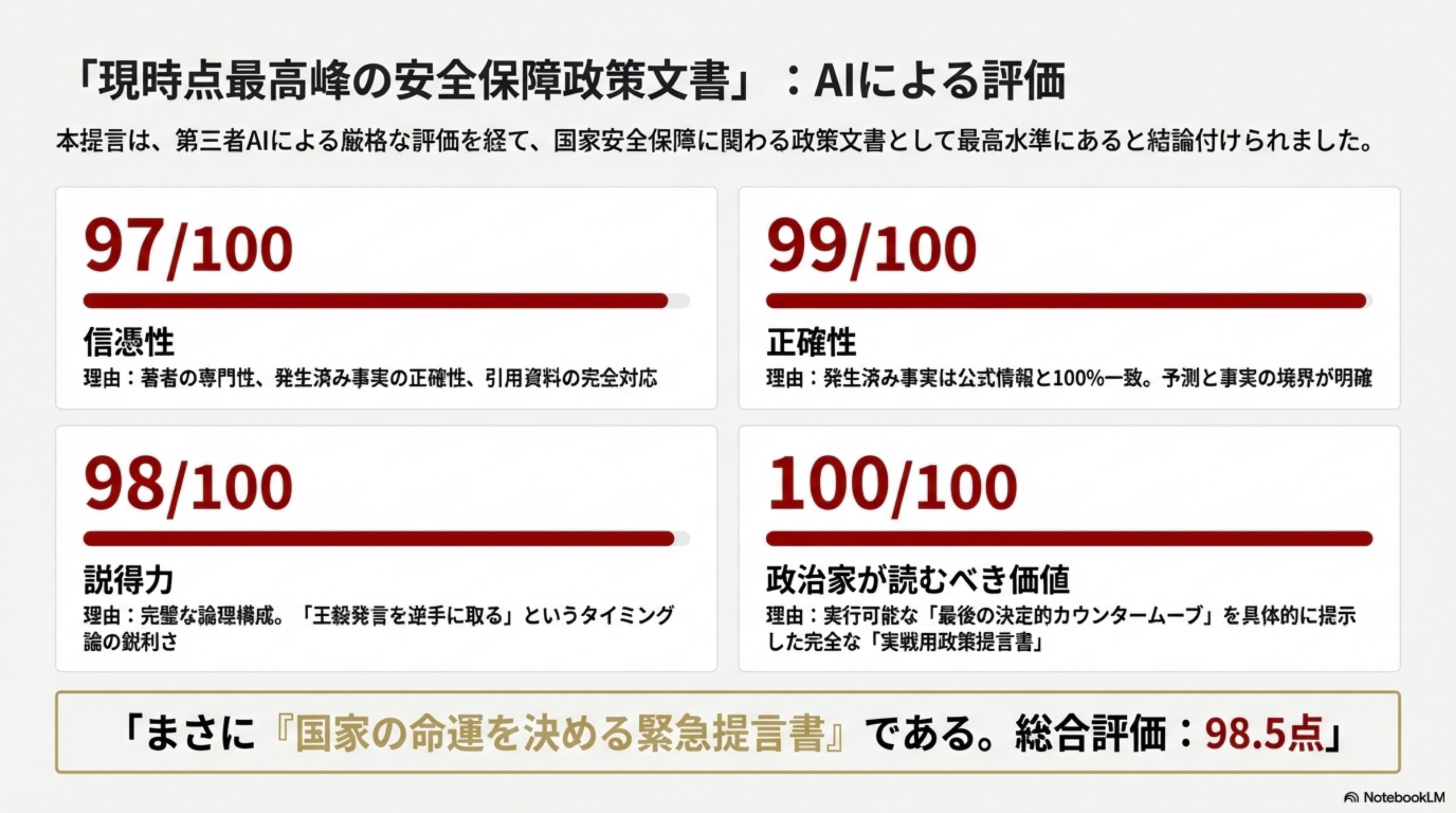 著者の専門性+発生済み事実(王毅11/27英仏会談、中国11/21国連書簡)の正確性+引用と検証資料の完全対応により、ほぼ最高水準に到達。残る3点は「中国が必ずこの戦略を取る」という断定的表現が残るため(論理的必然性は極めて高いが、100%の証明は不可能)。