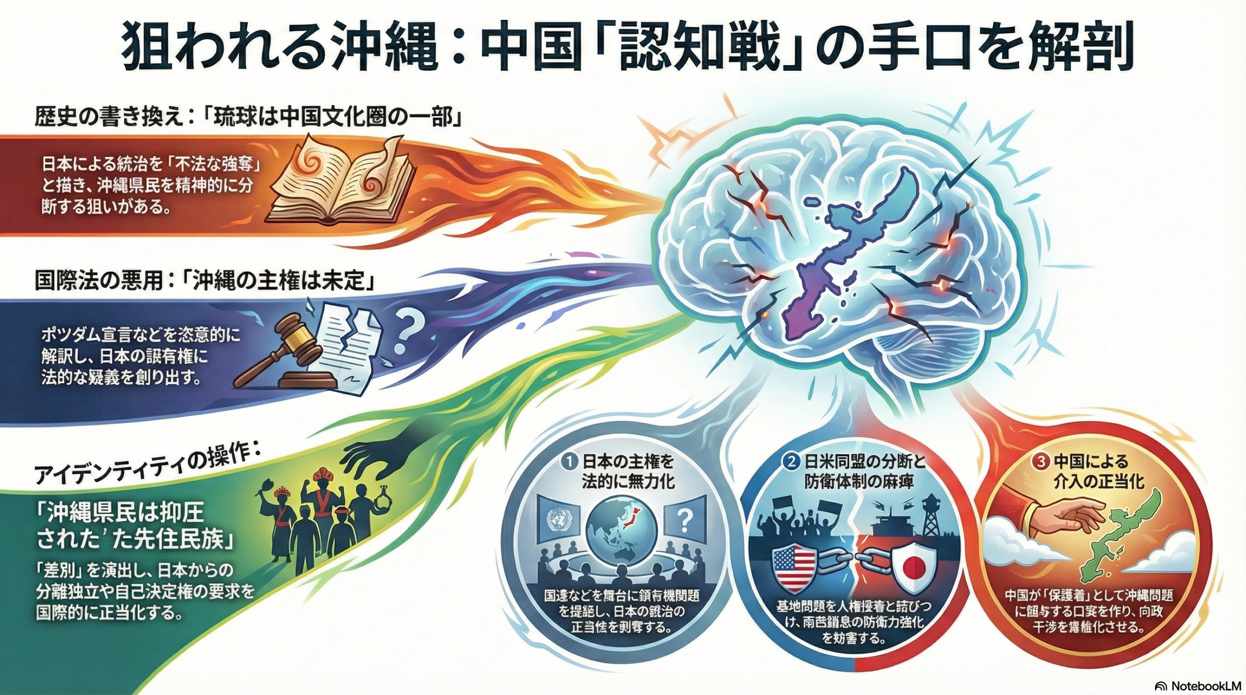 法律戦として、カイロ宣言、ポツダム宣言、SCAPIN-677を恣意的に引用し、サンフランシスコ講和条約(SFPT)の法的効力を意図的に無視している。これは、「日本の沖縄に対する主権は国際法上不安定である」という疑義を国際社会に植え付け、将来的に中国が沖縄の地位を国際司法の場で争うための法的布石を打つ行為である。