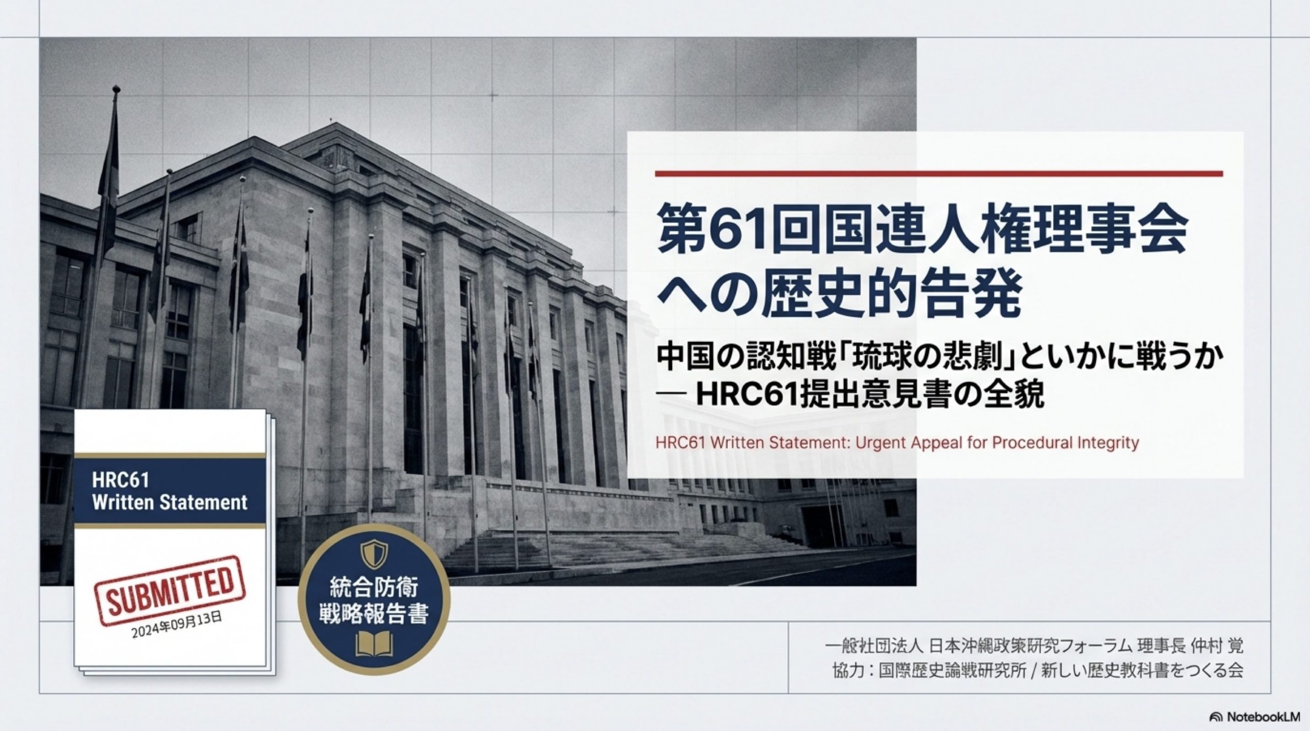 本資料は、2026年2月23日から開催される第61回 国連人権理事会(HRC61)に向けて提出された意見書の核心を解説するものです。 沖縄が「人権」を隠れ蓑にした主権解体工作(複合法律戦/Lawfare)の最前線となっているという問題意識のもと、国連を舞台とするナラティブウォー(物語の戦争)に対し、歴史的事実と民主的正当性をもって反論し、日本の法的基盤を守ることを目的とします。