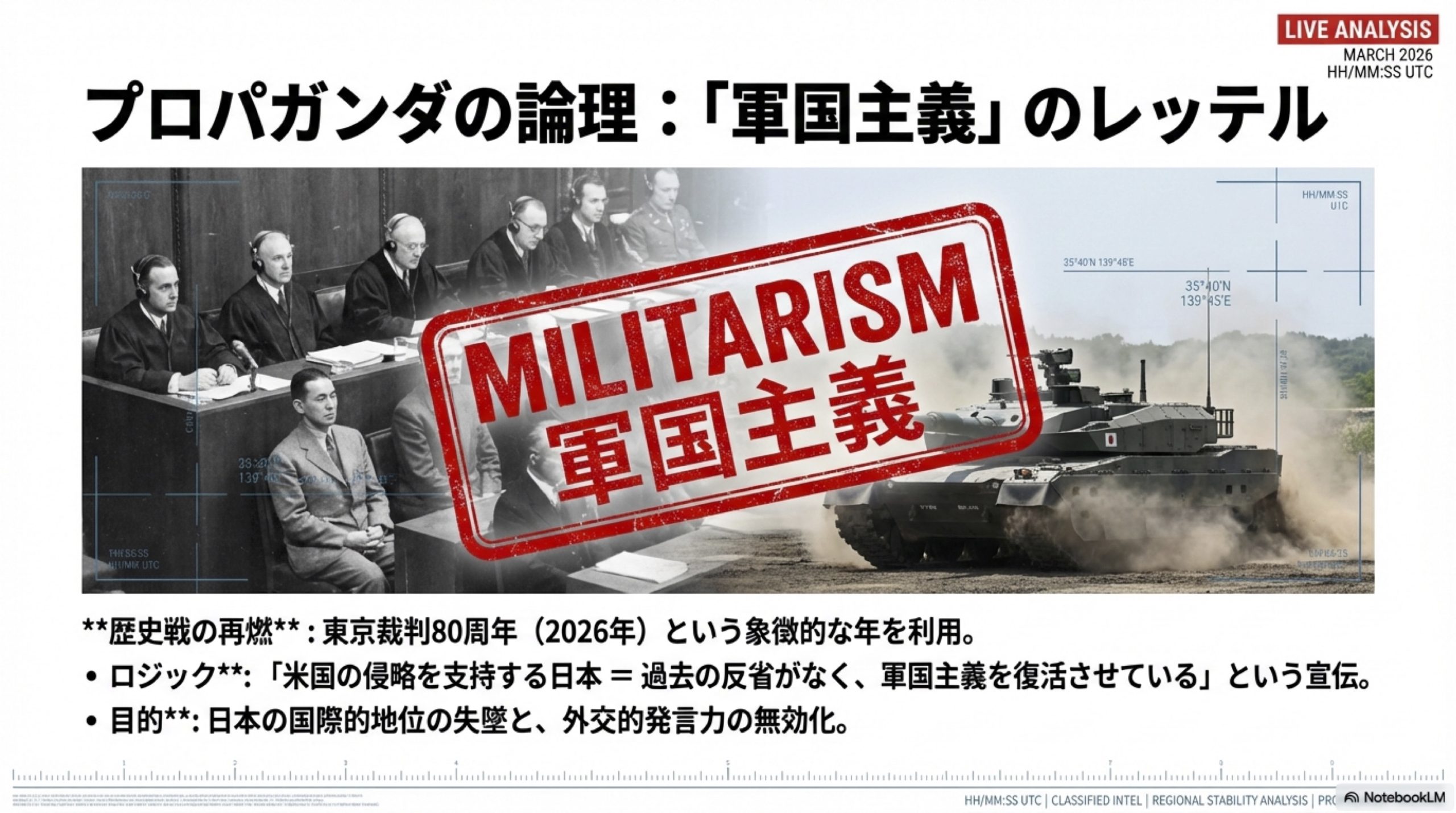 軍国主義復活のレッテル貼り: 中国は米国を支持する日本の姿勢を「過去の侵略への反省がなく、軍国主義を再燃させている」と宣伝し、東京裁判80周年(2026年)という歴史的象徴と結びつけて日本の国際的地位を失墜させようとしている。