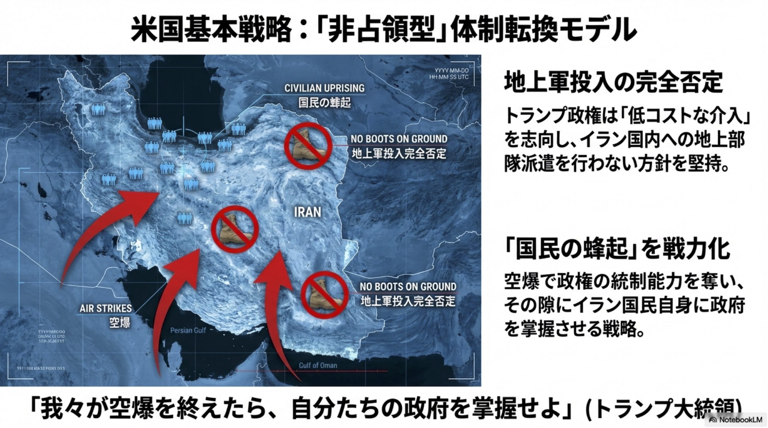 「国民の蜂起」を事実上の地上戦力に: 米軍は空爆によって政権の「脳(指導部)」と「盾(治安部隊)」を無力化し、その隙にイラン国民自身の手で政府を掌握させることを狙っている 。トランプ大統領は「我々が空爆を終えたら、自分たちの政府を掌握せよ」と呼びかけ、国民を実質的な「上陸部隊の代わり」として期待している 。