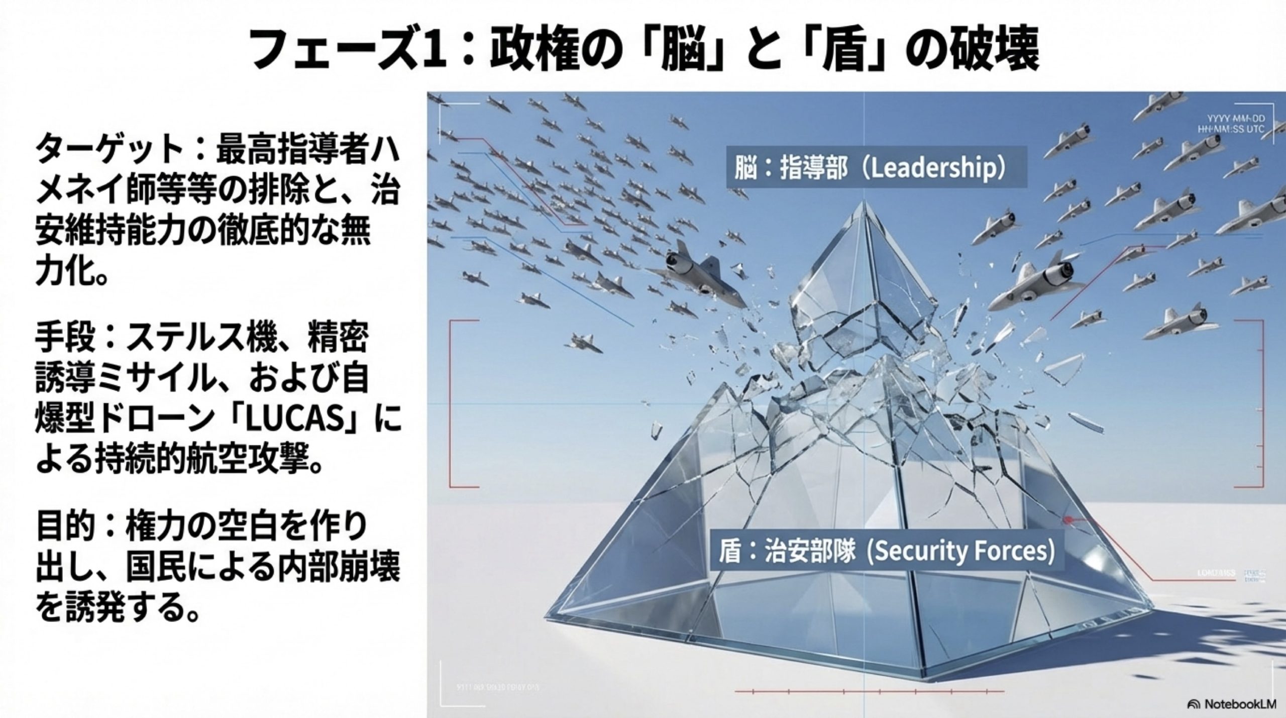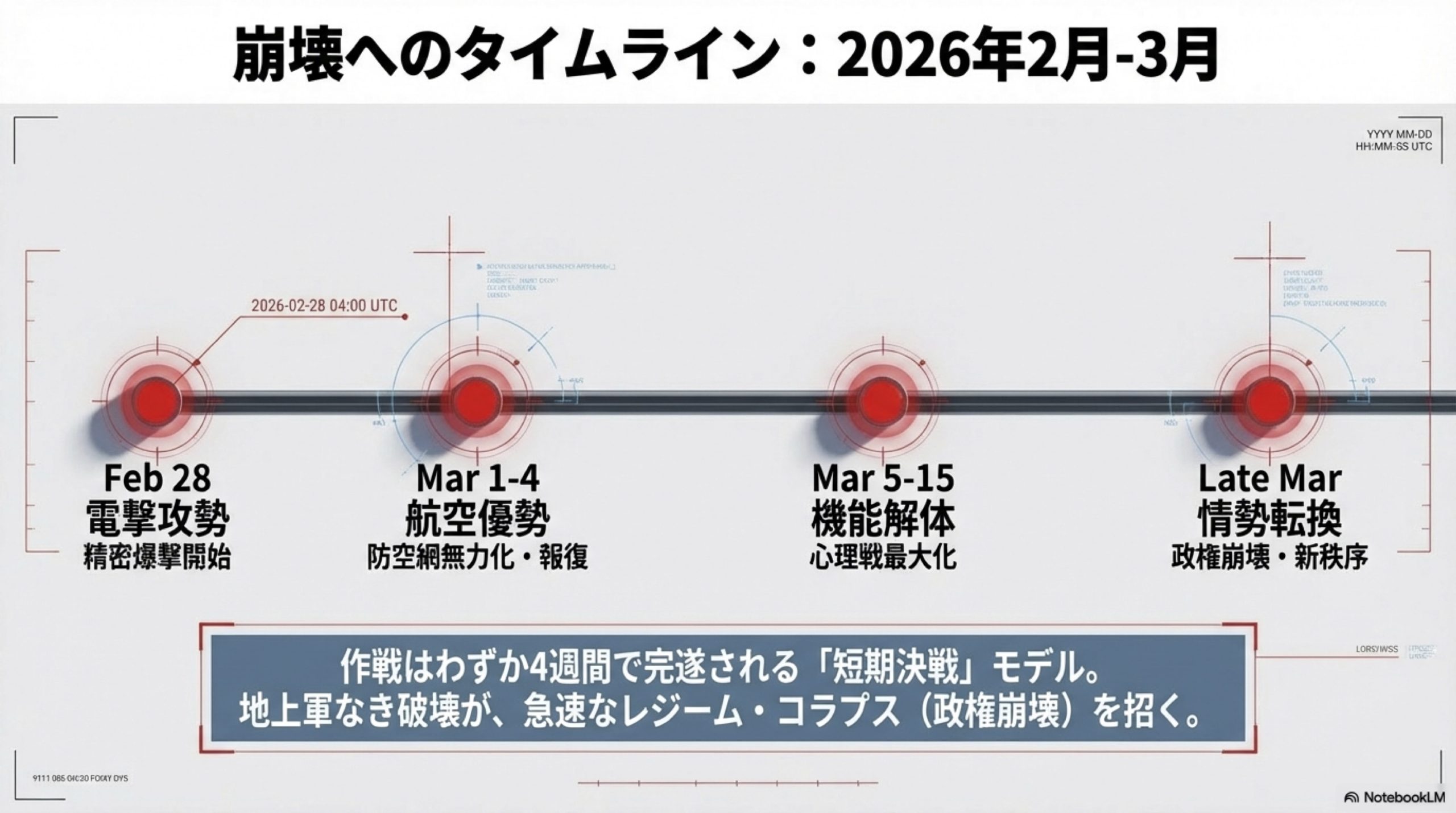 | 機能解体期 | 3月5日〜3月中旬 | 地上軍なき機能解体フェーズ。核施設等の破壊を継続し、国民による内部崩壊を促す心理戦を最大化 。 |
