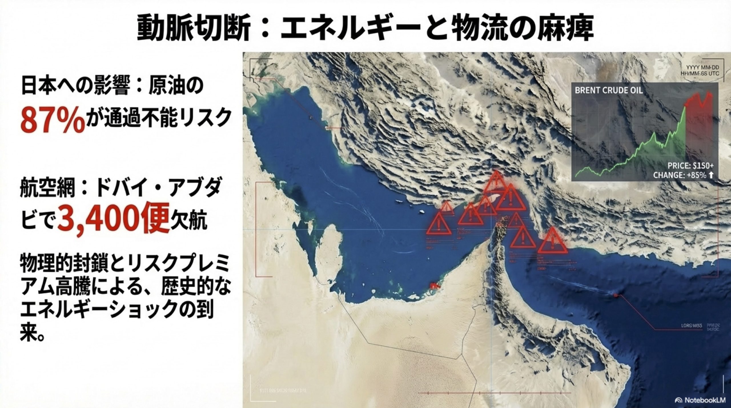 エネルギー安全保障: 日本は原油の約87%をホルムズ海峡の通過に依存しており、物理的封鎖やリスクプレミアムの上昇は歴史的な価格騰騰(エネルギーショック)を招く恐れがある 。