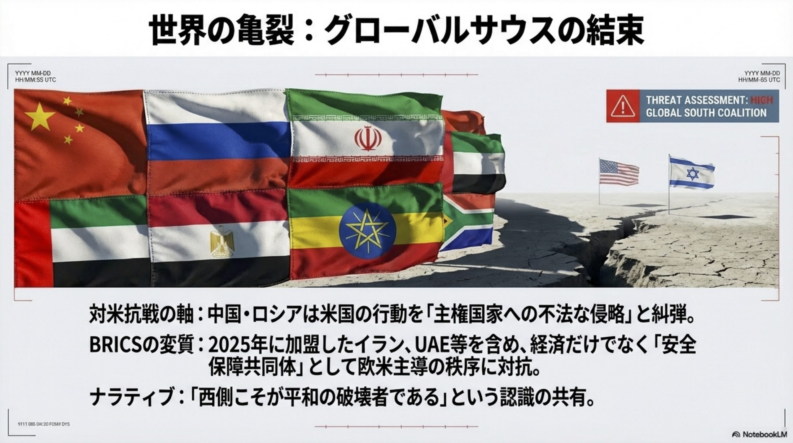 既存秩序の解体: 2025年にBRICSに加盟したイラン、UAE、エジプト、エチオピア等は、経済のみならず「安全保障共同体」として欧米主導の秩序に対抗する動きを強めている 。