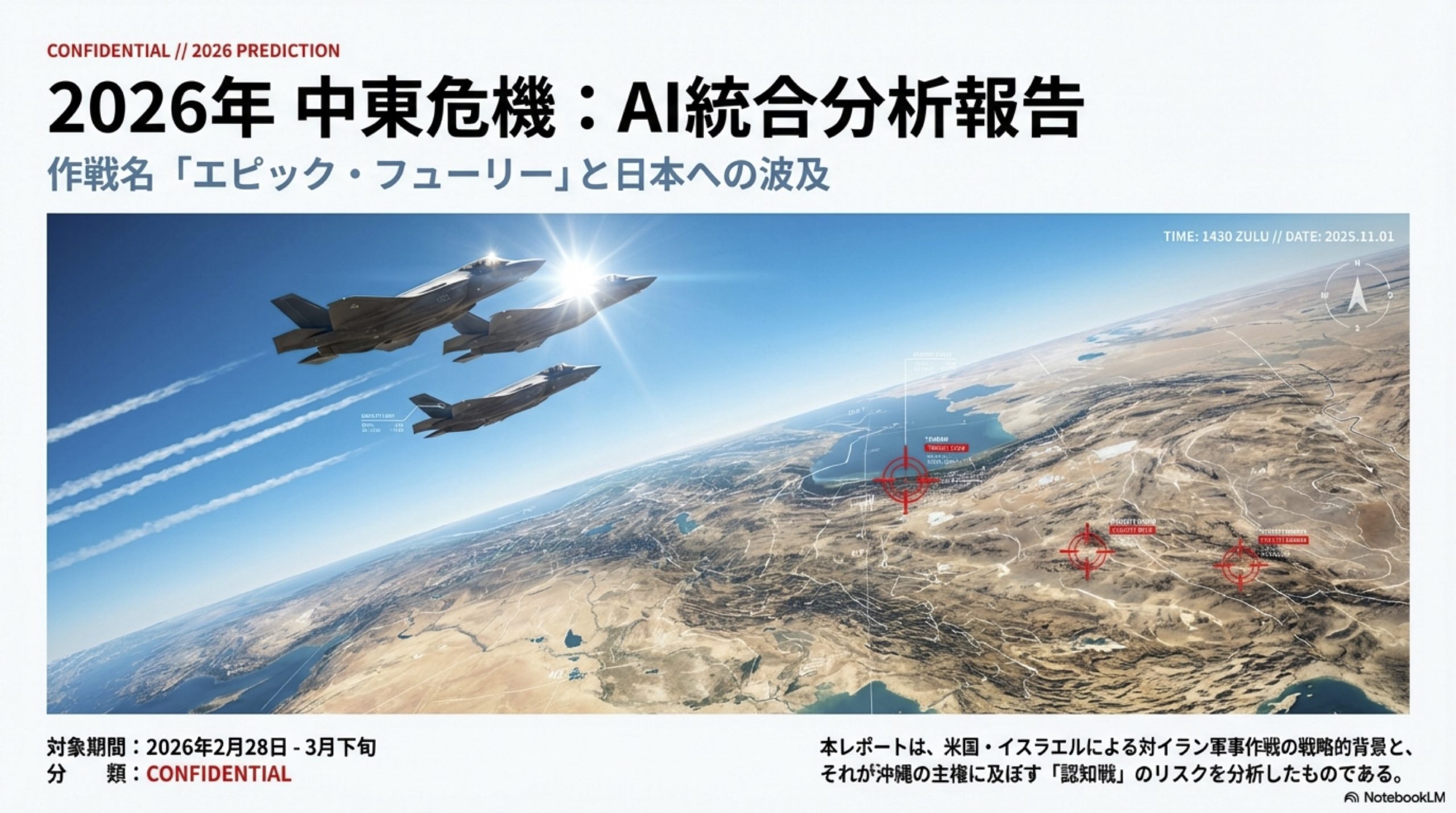 本レポートは、2026年2月28日に開始された米国・イスラエルによる対イラン軍事作戦「オペレーション・エピック・フューリー(Operation Epic Fury)」および「オペレーション・ローリング・ライオン(Operation Roaring Lion)」の戦略的背景、国際世論への波及、および日本・沖縄への主権侵害リスクについてAIが統合分析した結果である。
