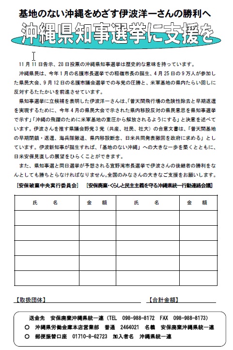 伊波新知事が誕生すれば、「基地のない沖縄」への大きな一歩を築くとともに、日米安保見直しの展望をひらくことができます。また、県知事選と同日選挙が予想される宜野湾市長選挙で伊波さんの後継者の勝利をなんとしても勝ちとらなければなりません。全国のみなさんの大きなご支援をお願いします。