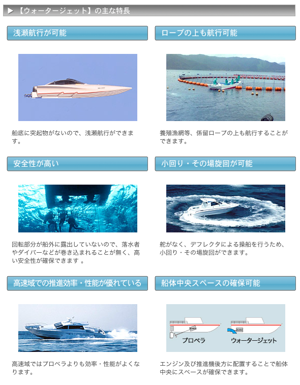 ウォータージェット推進という方式を使ったエンジンのようです。では、ウォータジェット推進方式だとどのような性能や利点があるのか調べてみました。あるメーカーが特徴を分かりやすく説明していました。