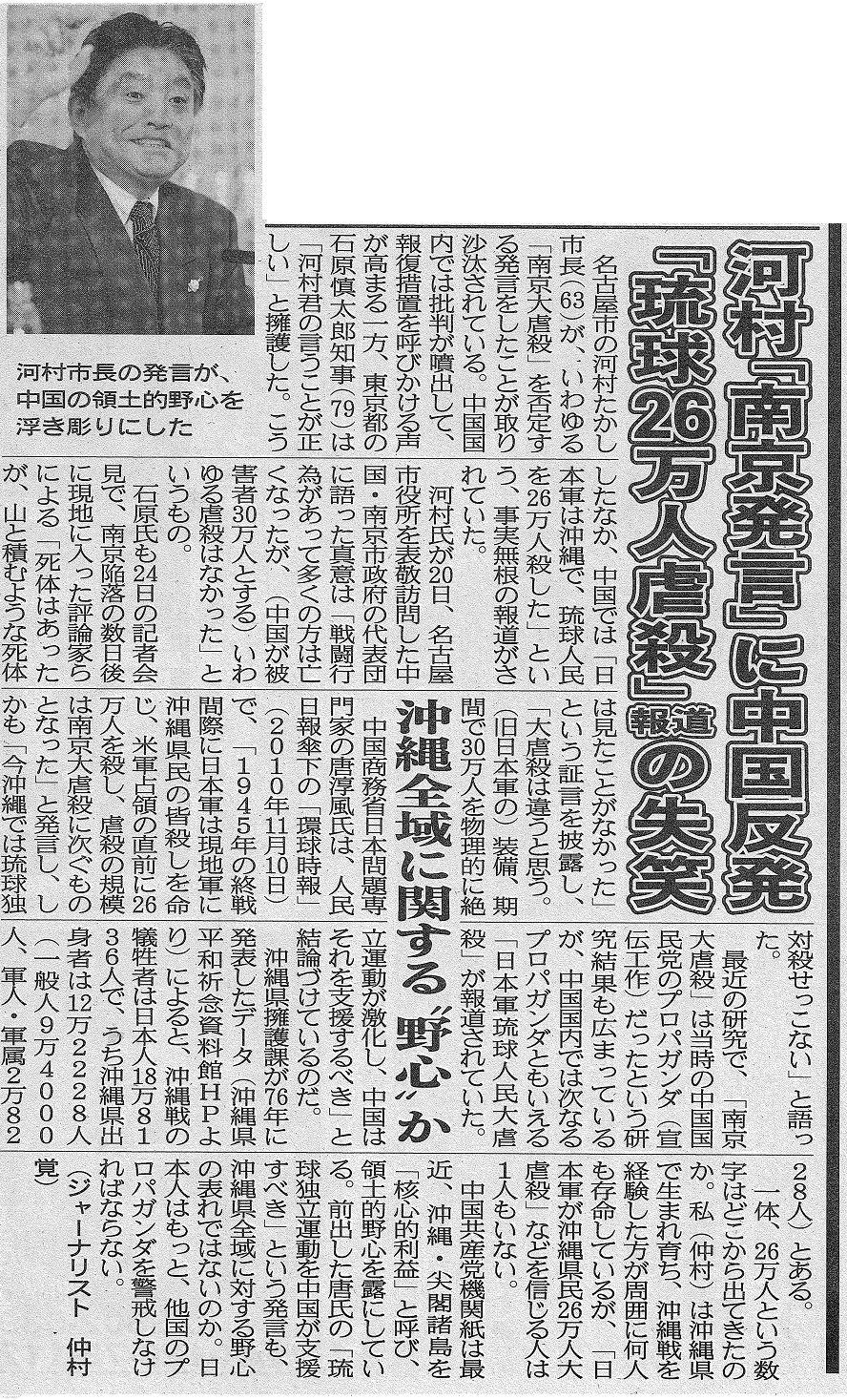 名古屋市の河村たかし市長(63)が、いわゆる「南京大虐殺」を否定する発言をしたことが取り沙汰されている。中国国内では批判が噴出して、報復措置を呼びかける声が高まる一方、東京都の石原慎太郎知事(79)は「河村君の言うことが正しい」と擁護した。こうしたなか、中国では「日本軍は沖縄で、琉球人民を26万人殺した」という、事実無根の報道がされていた。