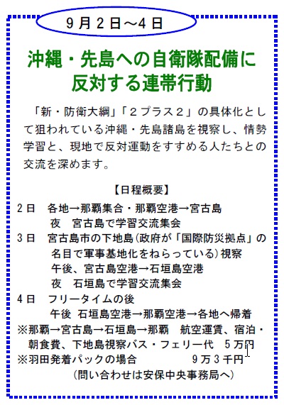 前回のブログでは、与那国島への自衛愛配備が着々と進められていると述べましたが、沖縄統一連では、先島への自衛隊配備を阻止するために、9月に宮古島、石垣島で集会を開催を計画しているようです。