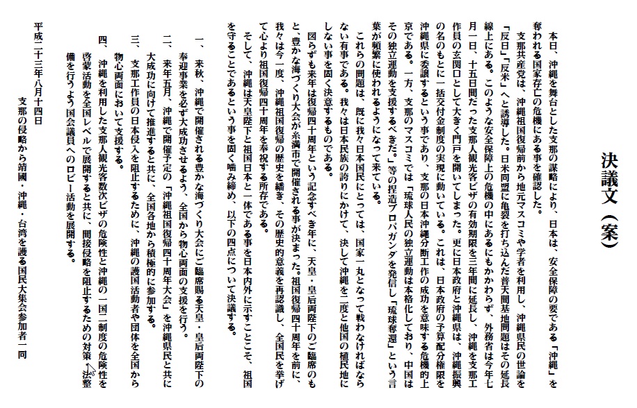 ■8・14支那の侵略から靖国・沖縄・日本を護る国民大集会第二弾 決議文