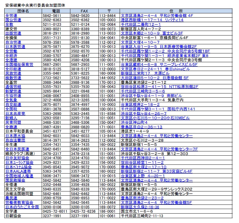 ネットでみつけた加盟団体のリストがあります。共産党系の組合とみられる全国組織を持つ46団体の名前が連ねられています。