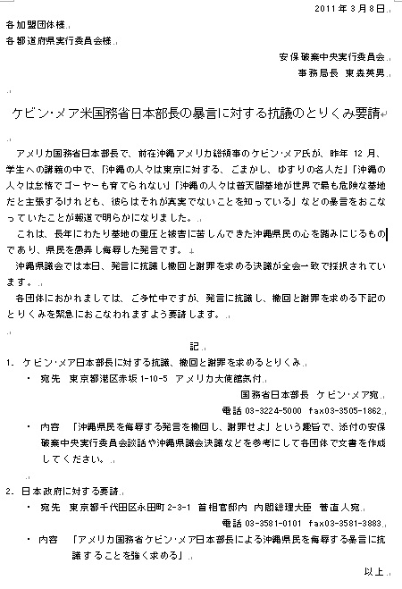 共同通信が3月6日の夕方に配信し、安保破棄中央実行委員会が事務局長名で翌々日には全国の加盟組織に抗議の依頼を要請しています。