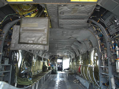 CH-47Jの内部の写真です。左右に折りたたみ式のパイプ椅子があります。55人の人員を輸送する事ができます。