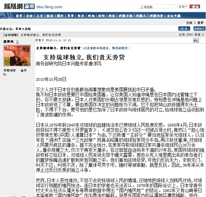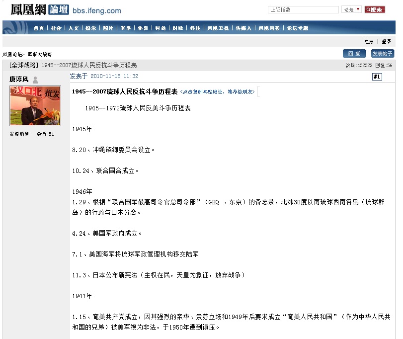 <琉球人民反抗闘争史年表が記載された鳳凰網のサイト>