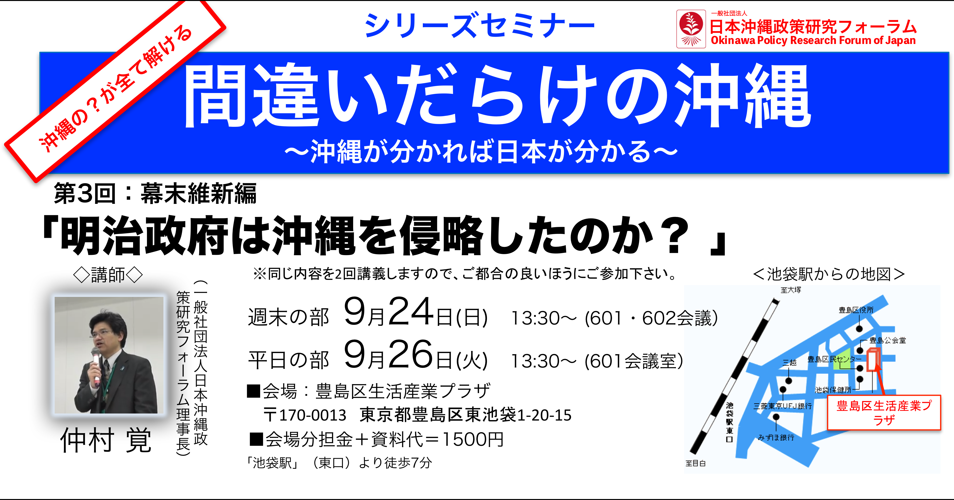 平成29年第8回 シリーズ「間違いだらけの沖縄」第3回「明治政府は沖縄を侵略したのか?」 連続セミナー動画 X Facebook はてブ Pocket LINE コピー 2017.10.012017.11.18 この記事は約1分で読めます。 Views: 1,778