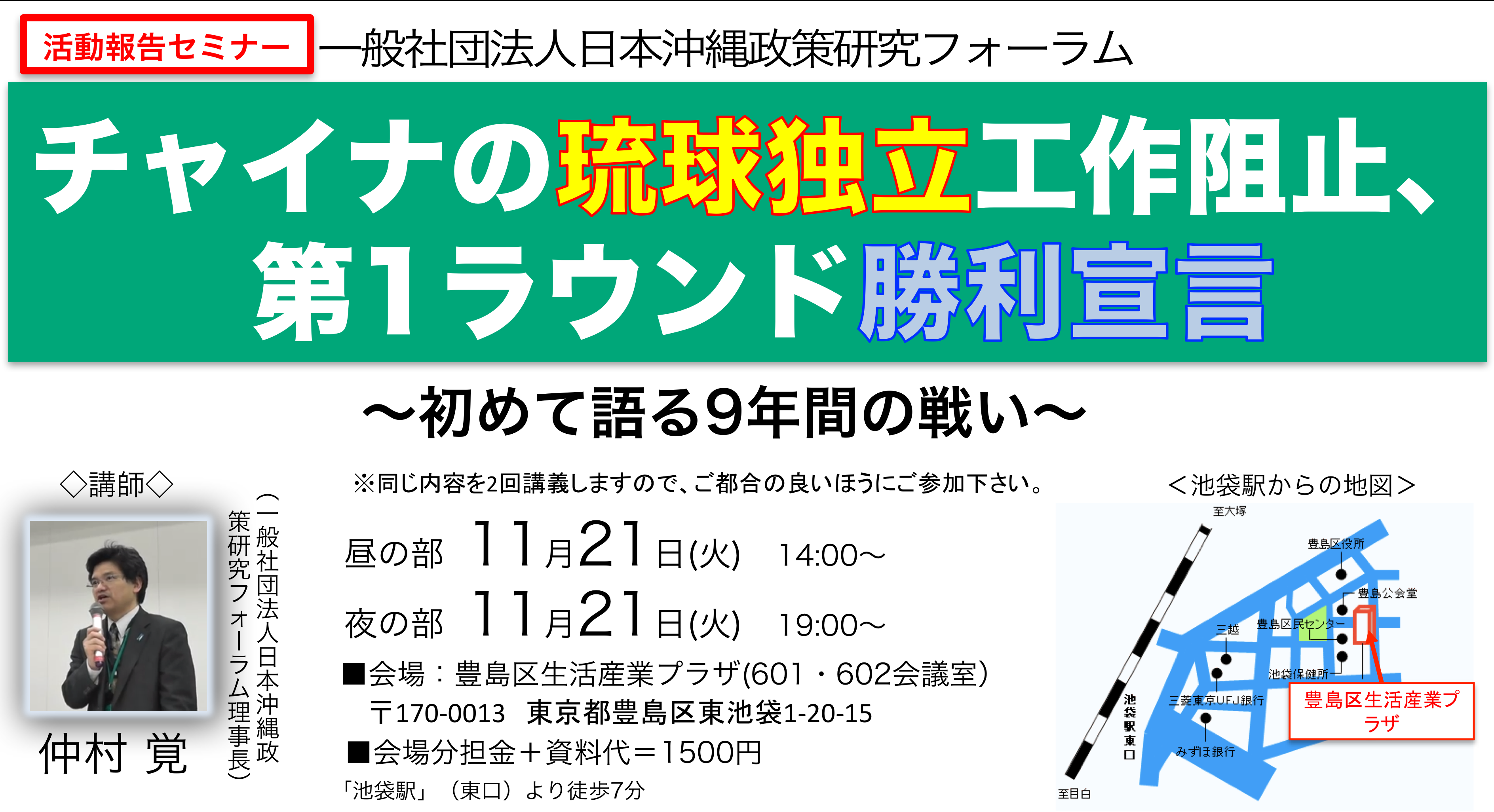 セミナーでは、その後のチャイナのプロパガンダの発信、沖縄の政治の動き、琉球独立派の動き、国会の動き、そして、それに対して我々がどのように動き、阻止してきたかを解説したいと思います。