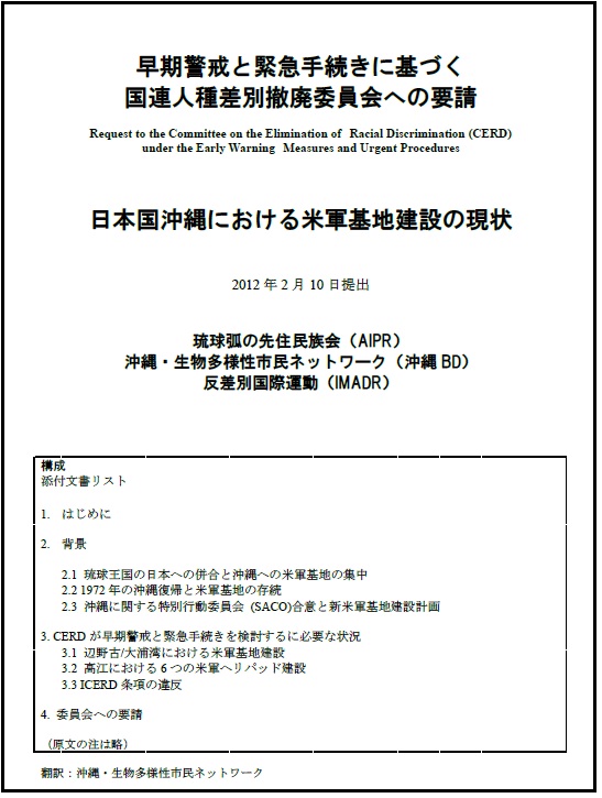 まず、沖縄2団体と国連に発言権を持つNGO団体が国連人種差別撤廃委員会へ提出したという要請文を見てみましょう!
