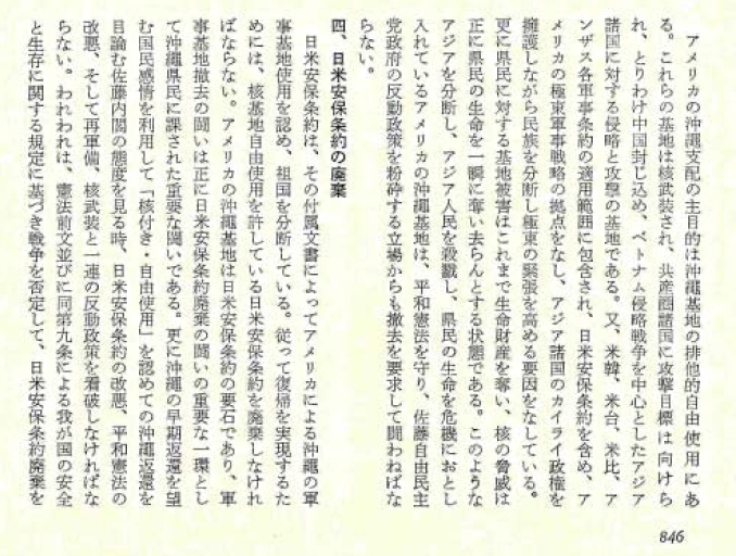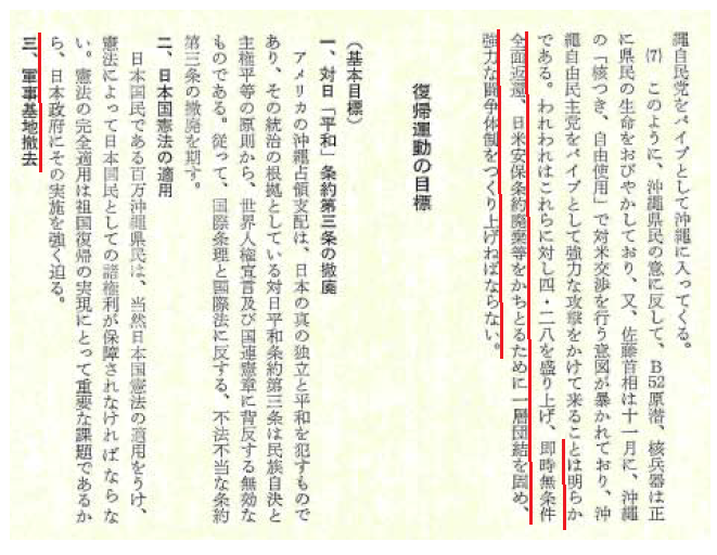 アメリカの沖縄支配の主目的は沖縄基地の排他的自由使用にある。これらの基地は核武装され、共産圏諸国に攻撃目標は向けられ、とりわけ中国封じ込め、ベトナム侵略戦争を中心としてアジア諸国に対する侵略と攻撃の基地である。又、米韓、米台、米比、アンザス各軍事条約の適用範囲に包含され、日米安保条約を含め、アメリカの極東軍事戦略の拠点をなし、アジア諸国のカイライ政権を擁護しながら民族を分断し極東の緊張を高める要因をなしている。更に県民に対する基地被害はこれまで生命財産を奪い、核の脅威は正に県民の生命を一瞬に奪い去らんとする状態である。このようなアジアを分断し、アジア人民を殺戮し、県民の生命を危機におとしいれているアメリカの沖縄基地は、平和憲法を守り、佐藤自由民主党政府の反動政策を粉砕する立場からも撤去を要求して闘わねばならない。