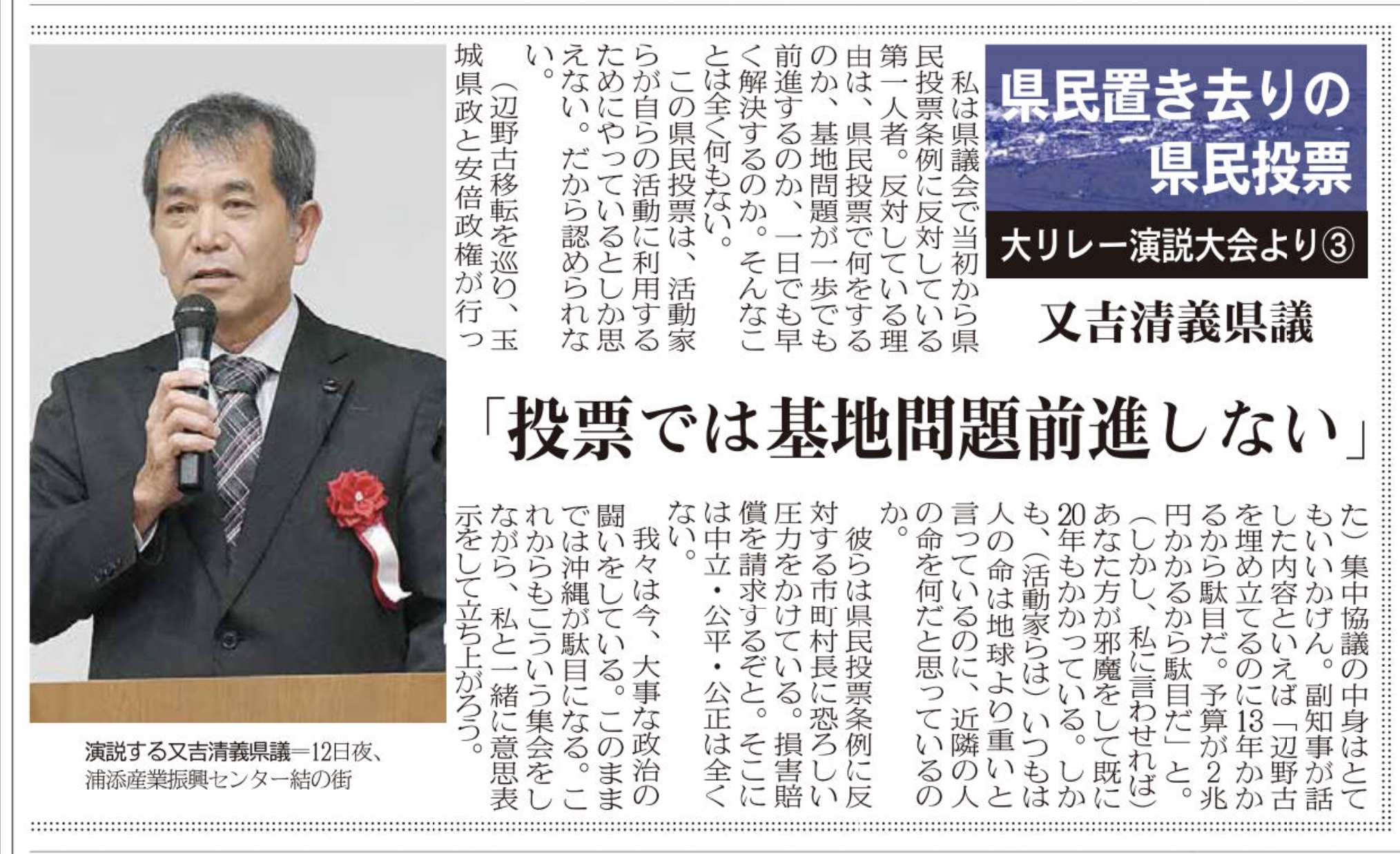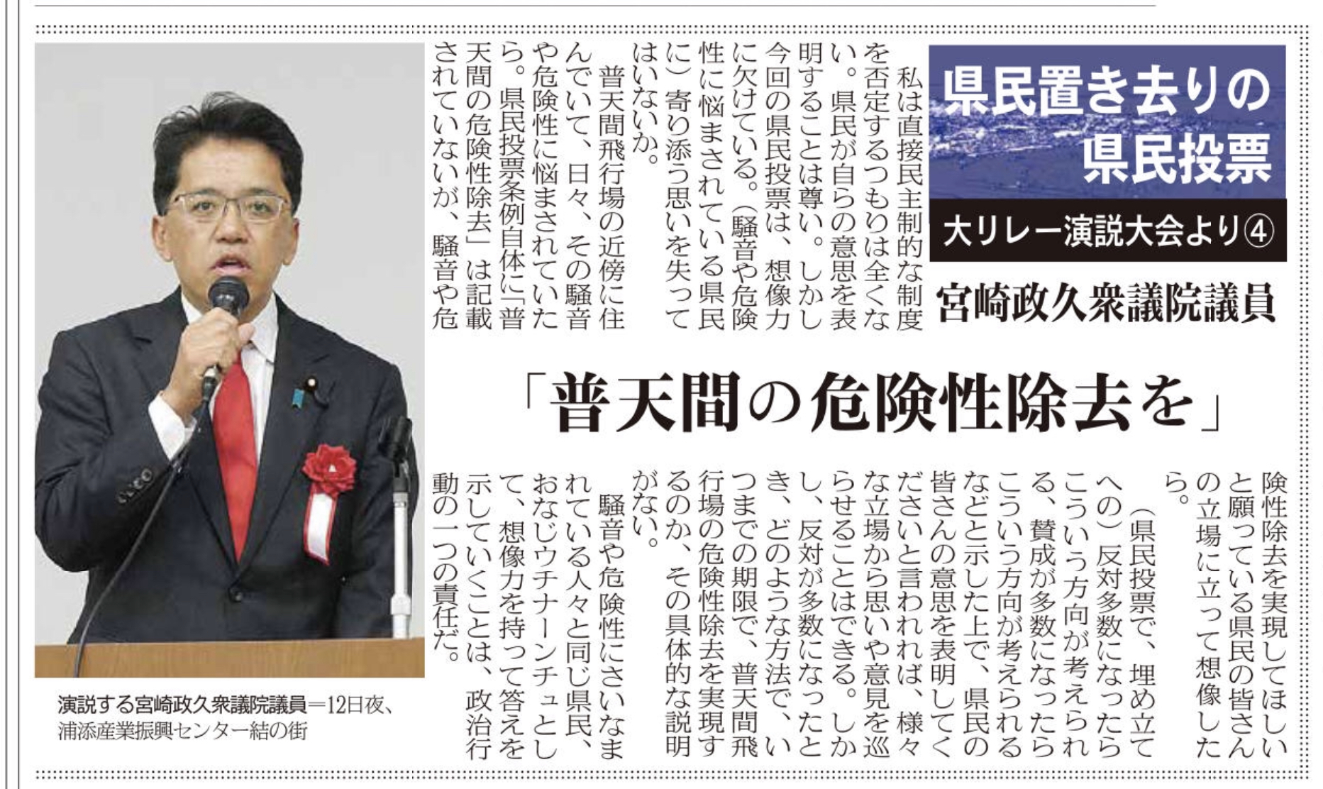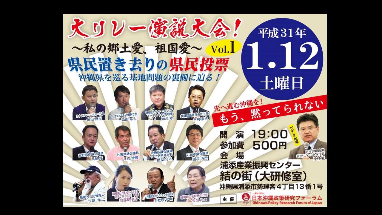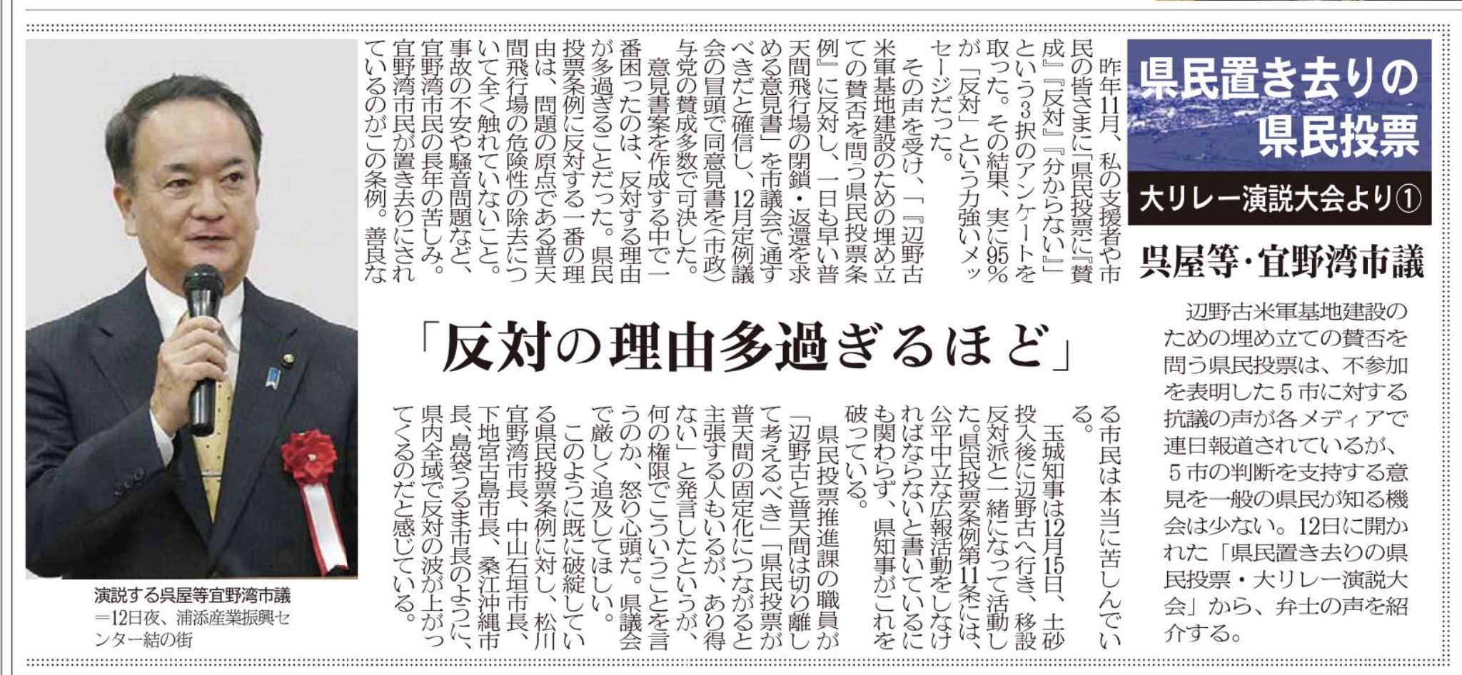 【イベント報告】1・12「県民置き去りの県民投票・大リレー演説大会」〜私の祖国愛・郷土愛〜 メディア掲載 X Facebook はてブ Pocket LINE コピー 2019.01.242019.02.10 この記事は約2分で読めます。 ◎衆議院議員 宮崎政久氏 ◎元宜野湾市議会議員 平安座唯雄氏 ◎宜野湾市議会議員 呉屋等氏 ◎石垣市議会議員 砥板芳行氏 ■八重山日報連載 Views: 2,702