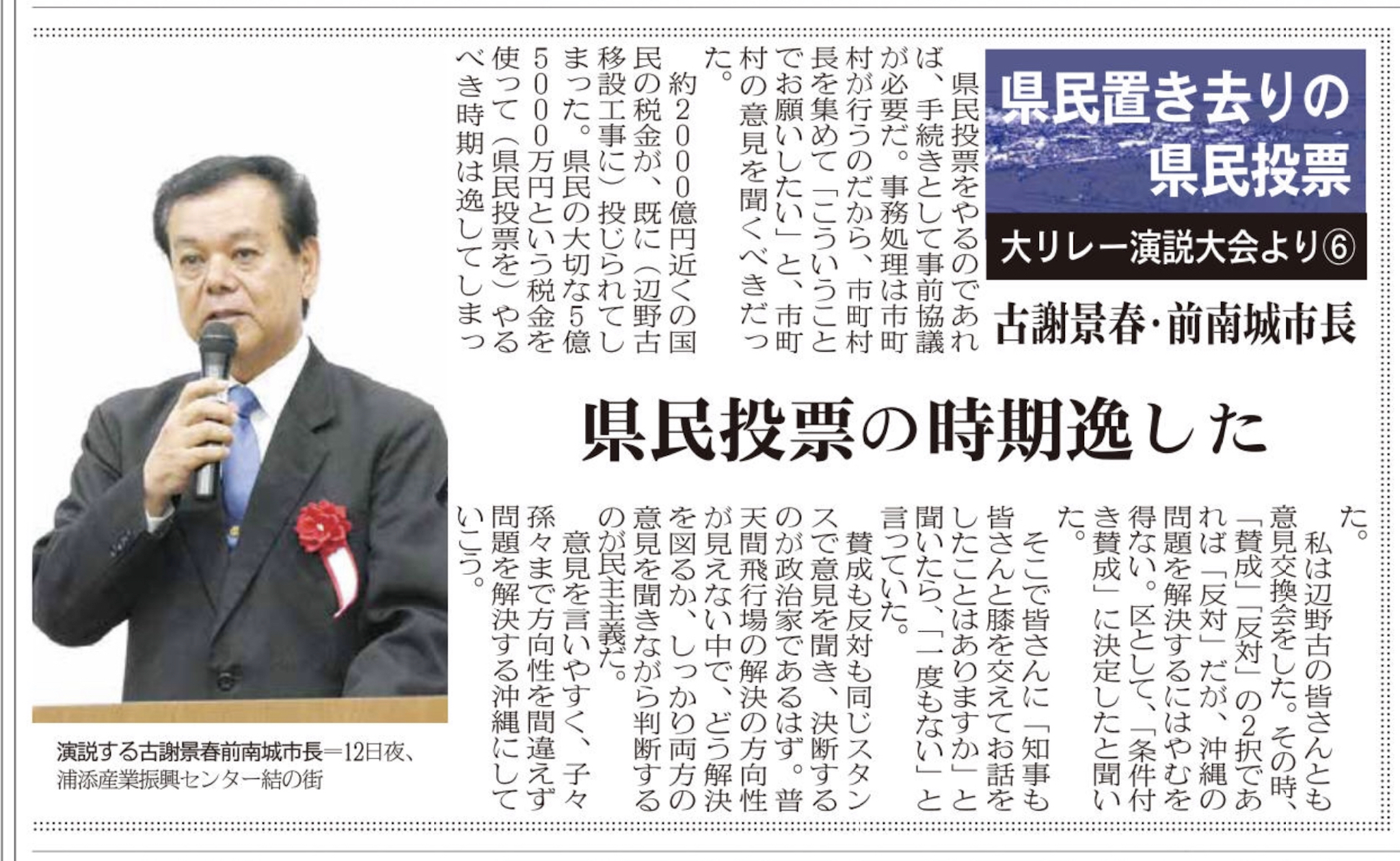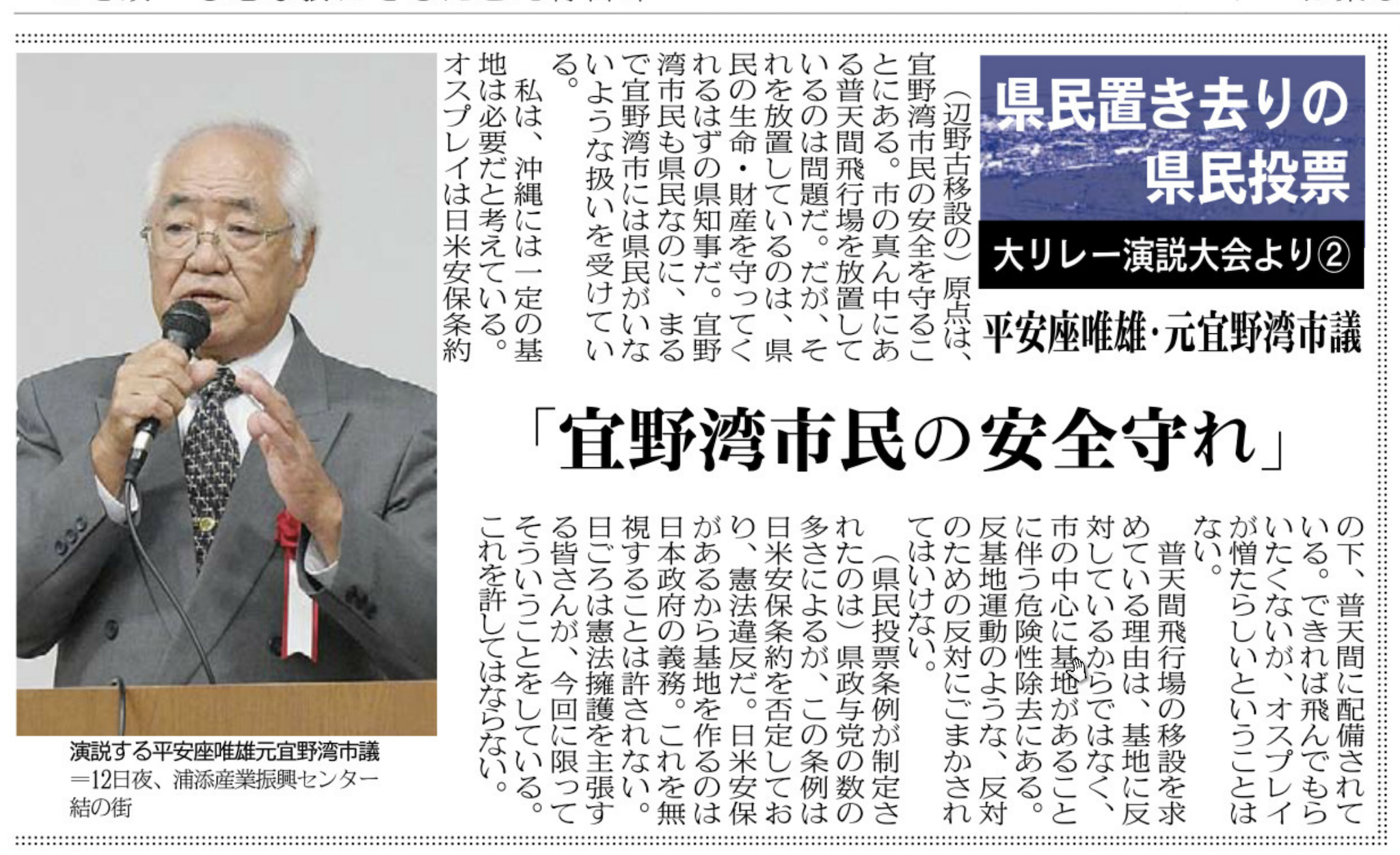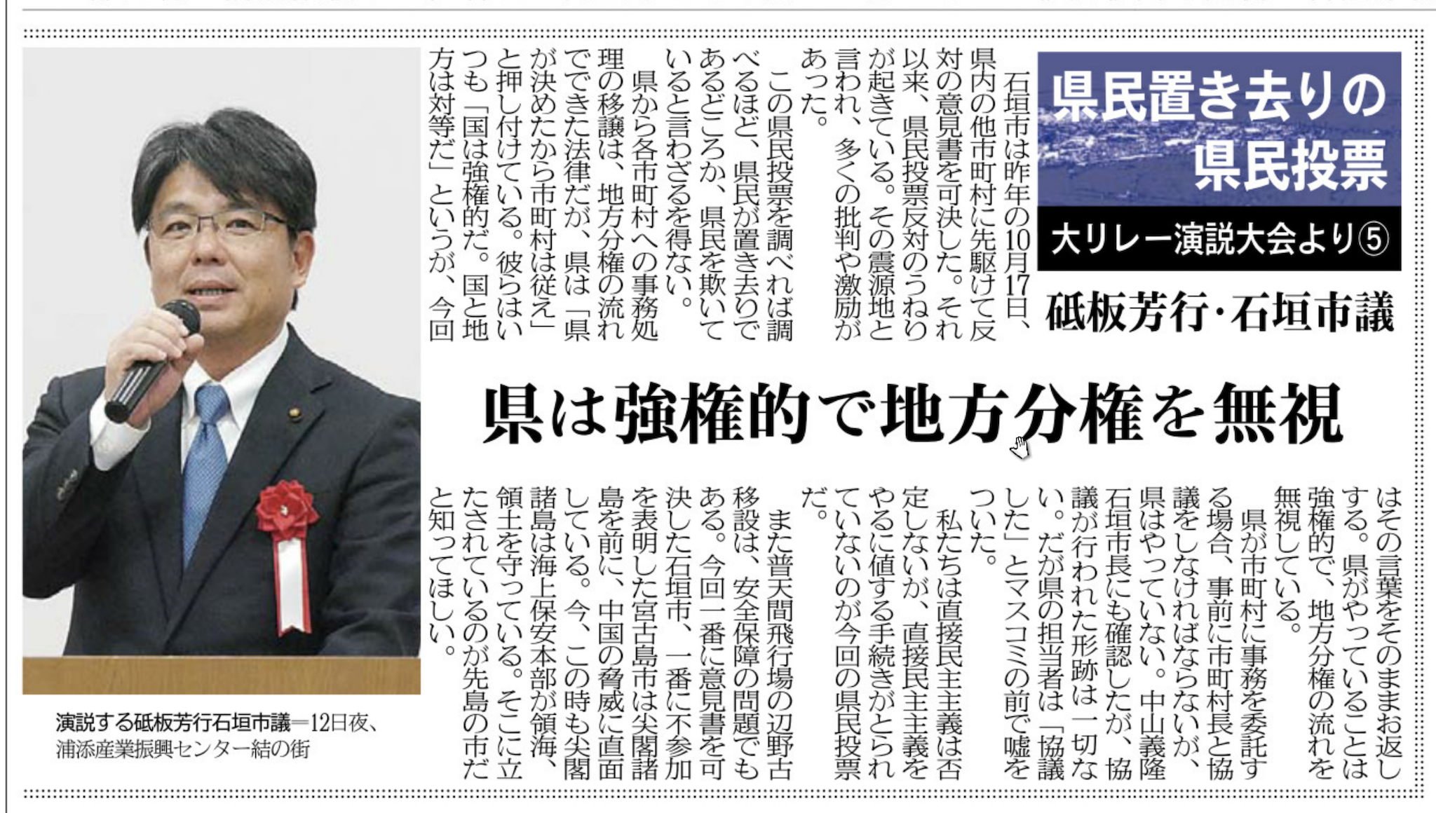 【イベント報告】1・12「県民置き去りの県民投票・大リレー演説大会」〜私の祖国愛・郷土愛〜 メディア掲載 X Facebook はてブ Pocket LINE コピー 2019.01.242019.02.10 この記事は約2分で読めます。 ◎衆議院議員 宮崎政久氏 ◎元宜野湾市議会議員 平安座唯雄氏 ◎宜野湾市議会議員 呉屋等氏 ◎石垣市議会議員 砥板芳行氏 ■八重山日報連載 Views: 2,702