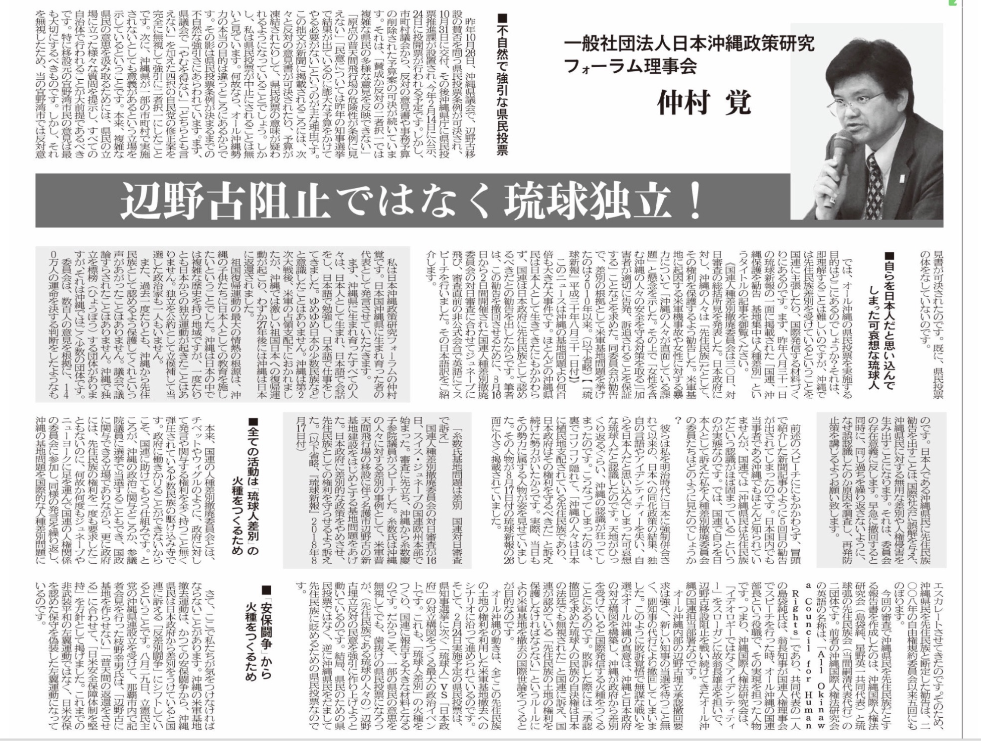 私は日本沖縄政策研究フォーラムの仲村覚です。日本国沖縄県に生まれ育った者の代表として発言させていただきます。