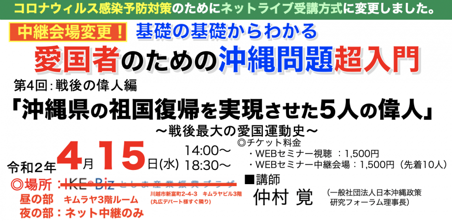 沖縄フォーラム■ 4・15【沖縄問題超入門】4回(昼の部&夜の部):戦後の偉人編「沖縄県の祖国復帰を実現させた5人の偉人」