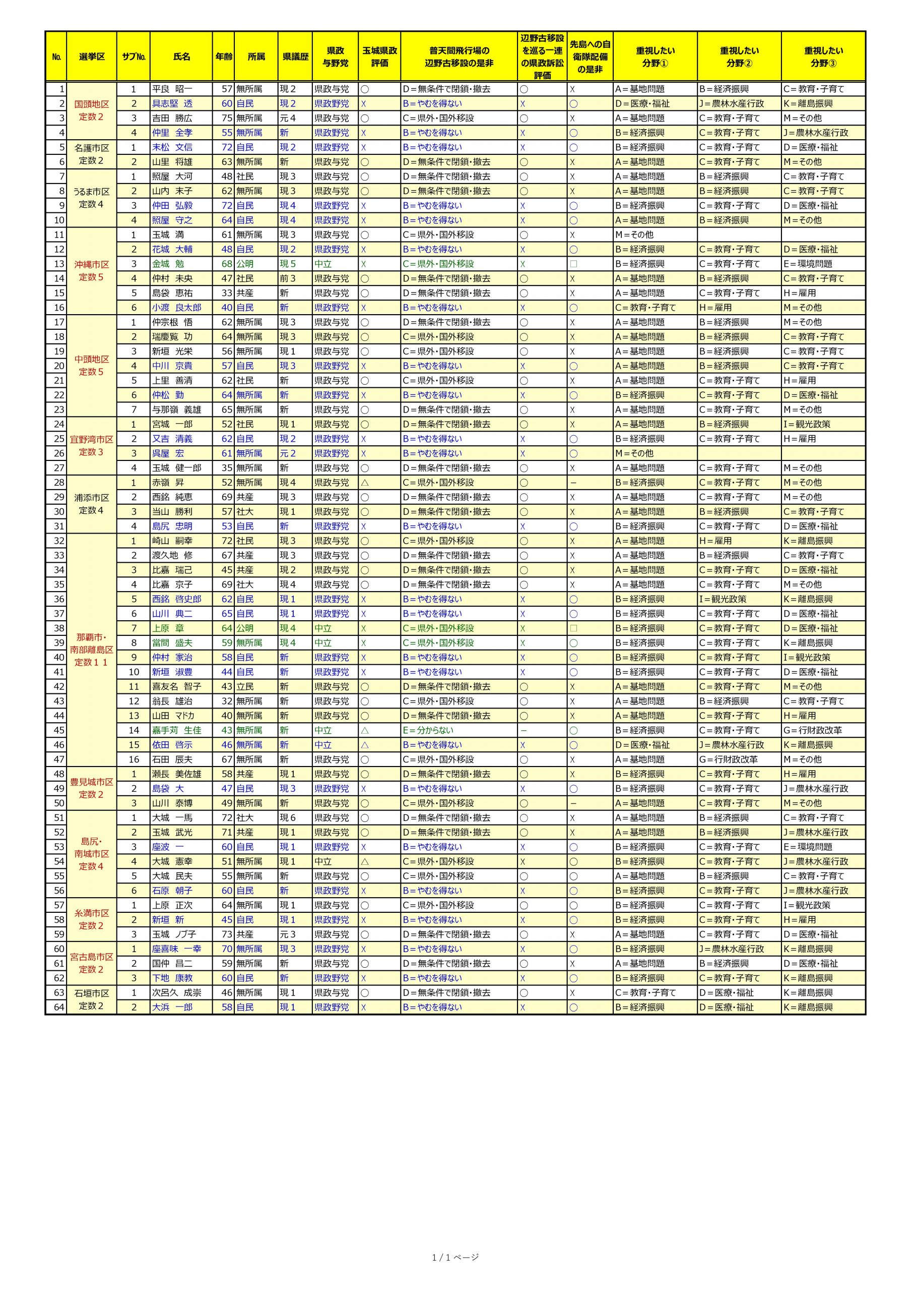 琉球新報5月4日付け紙面より、同社が立候補予定者に行った政策アンケート結果表を、表計算ソフトに入力してまとめ直しました。