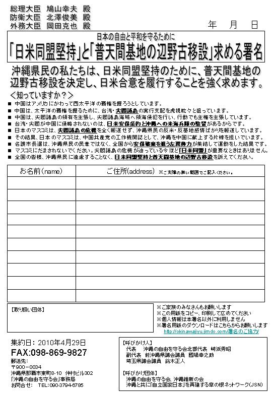 「日米同盟堅持」と「普天間基地の辺野古移設」を求める署名活動のお願い