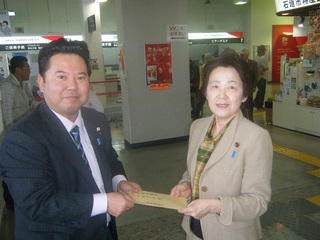石垣島空港で鈴木正人先生から、「日本の領土を守るため行動する議員連盟」山谷えり子先生へ要望書を手渡していただけました