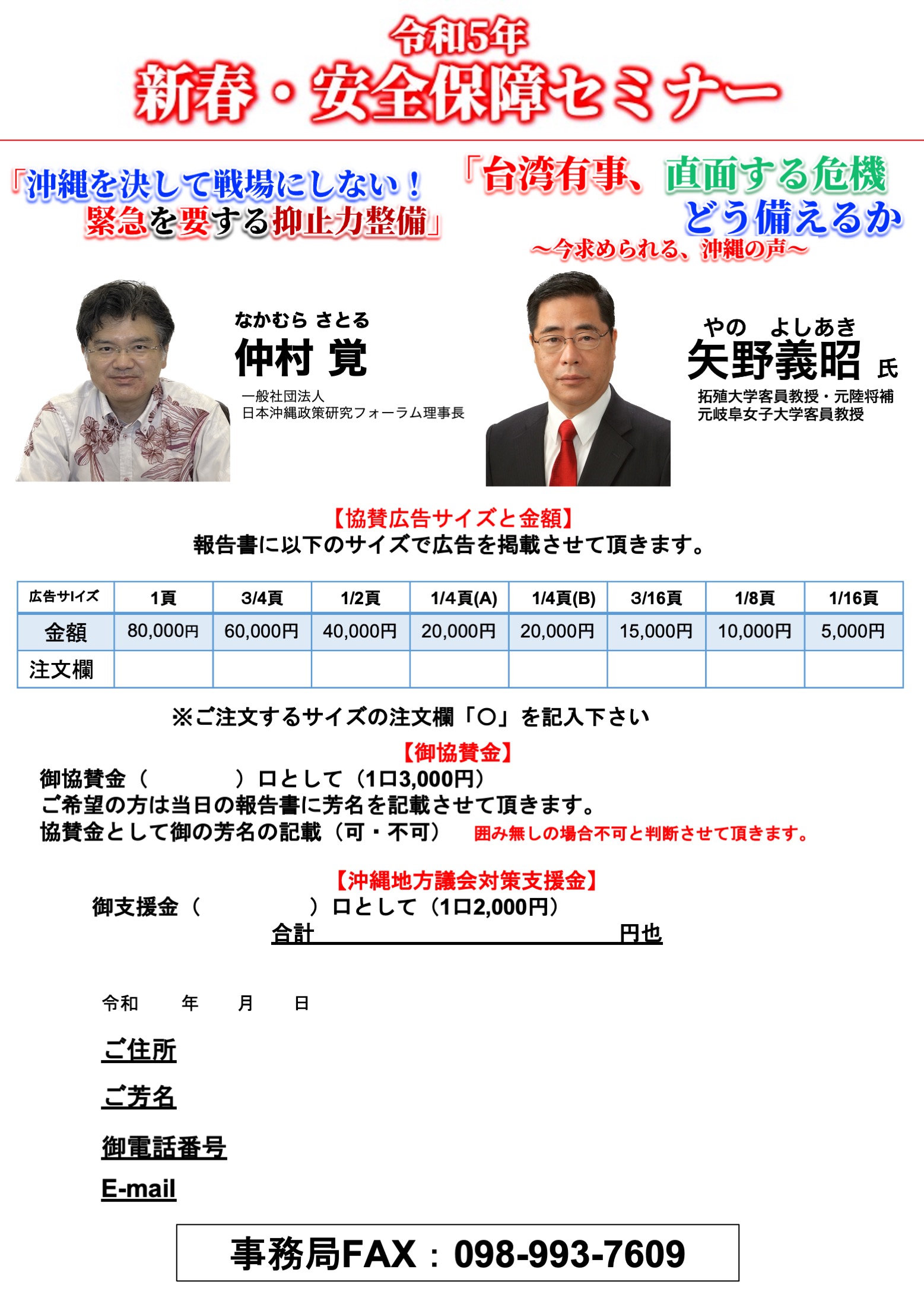 【協賛広告、サイズと金額】 ◎ 1ページ :8万円 ◎ 2/3ページ :6万円 ◎ 1/2ページ :4万円 ◎ 1/4ページ(A):2万円 ◎ 1/4ページ(B):2万円 ◎ 3/16ページ :1万5千円 ◎ 1/8ページ :1万円 ◎ 1/16ページ :5千円 ———————< ◇協賛広告、御協賛金は報告書に掲載します。 【御協賛金】御協賛金(1口3,000円)___口として___ 【沖縄地方議会対策基金】 合計____________________________ 上記の通り申し込みます 令和 年 月 日 ◎ご住所ご芳名_______________________ ◎御電話番号_______________________ ◎E-mail:______________________ 事務局FAX: 098-993-7609 |