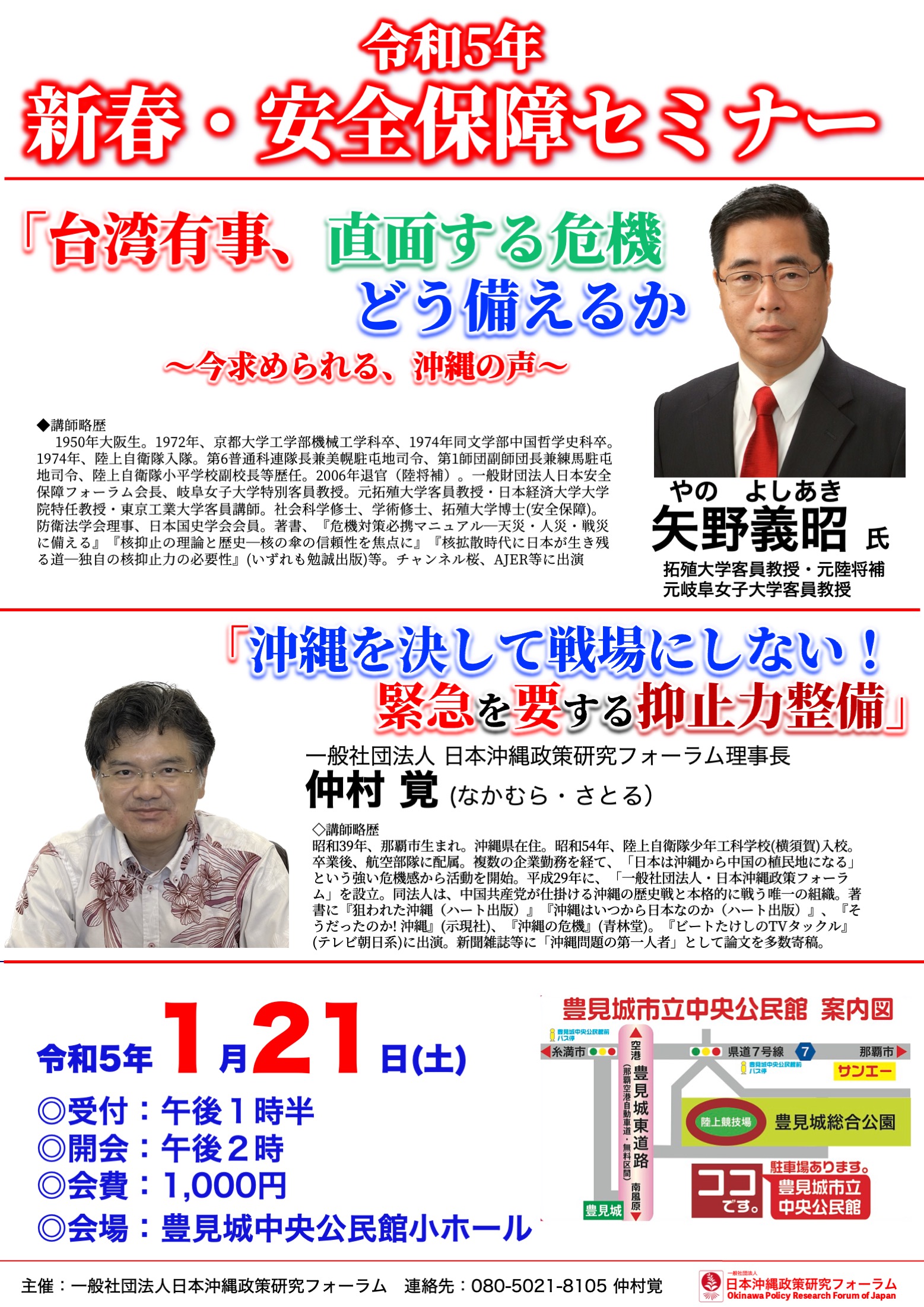 よって、日本沖縄政策研究フォーラムでは、来年1月21日元陸上自衛隊陸将補の矢野義昭様をお招きして、令和5年侵襲安全保障セミナー、「台湾有事、直面する危機にどう備えるか〜今求められる起きな声」を開催する運びとなりました。つきましては、ご多忙の折、誠に恐縮でございますが、何卒格別のご高配を以て、ご協賛いただけるよう、宜しくお願い申し上げます。また、当フォーラムが、安定的長期的に活動を継続できるよう、クレジット決済によるご入会をおねがいいたします。末筆ではございますが、皆様の益々のご健勝を心よりお祈り申し上げます。