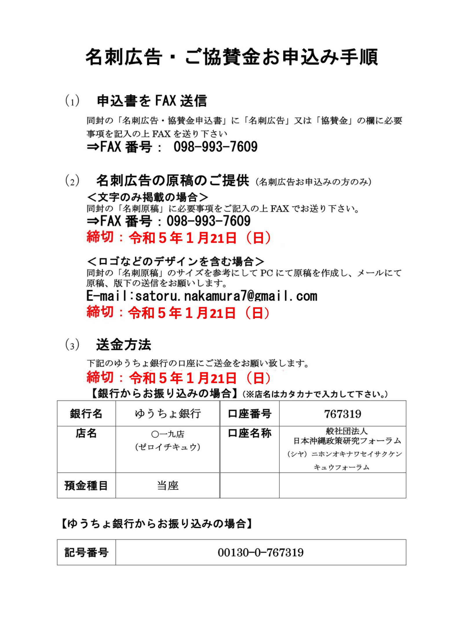 https://www.okinawa-seisaku.org/wp/wp-content/uploads/2022/12/b1436ef61b6b376951fa0512a4fec142.pdf <ご協賛金お申し込み手順> (1)申込書をFAXまたはメール送信 (2) 名刺広告の原稿のご提供 (名刺広告お申込みの方のみ) ◎ご送金締切日: 令和5年1月21日(日) ◎振込口座 【銀行からお振り込みの場合】(※店名はカタカナで入植してくだ 【ゆうちょ銀行からお振り込みの場合】 ◎申し込み書送信先 <申込書> https://drive.google.com/file/d/1BioORuMM0rx86pqt5Ikexo1tgEhom_pN/view?usp=sharing |
