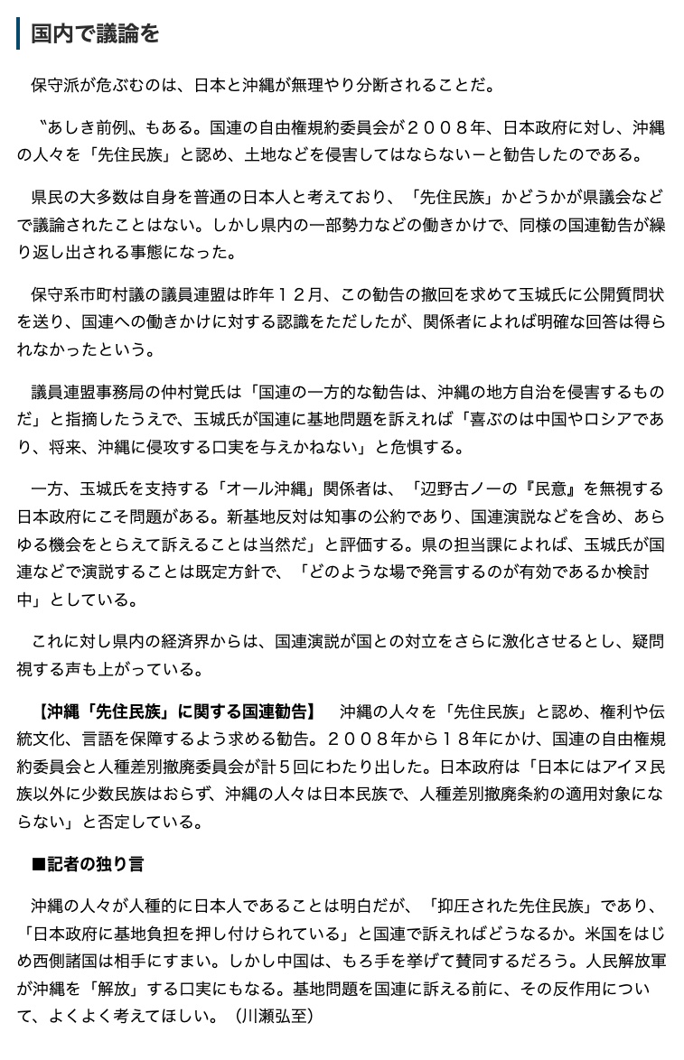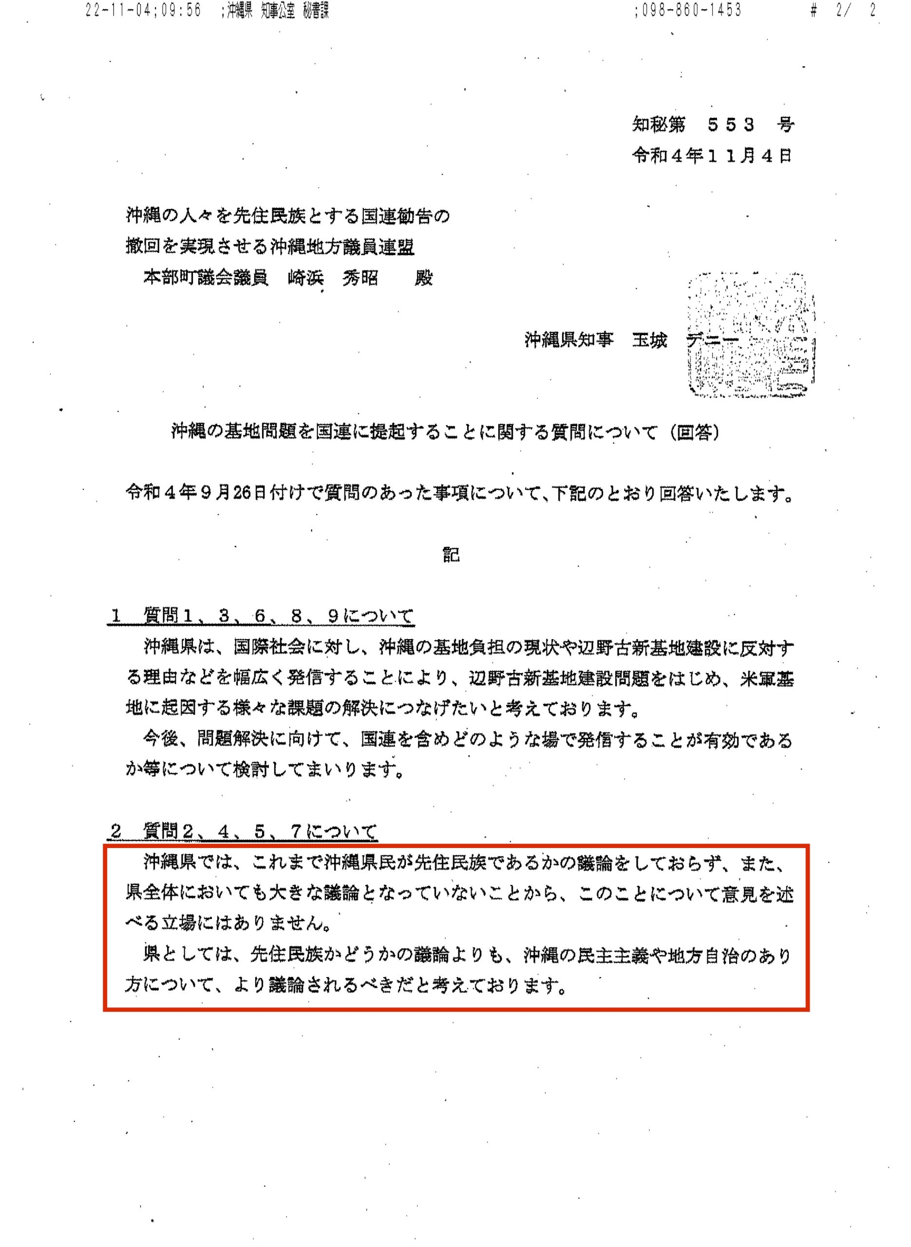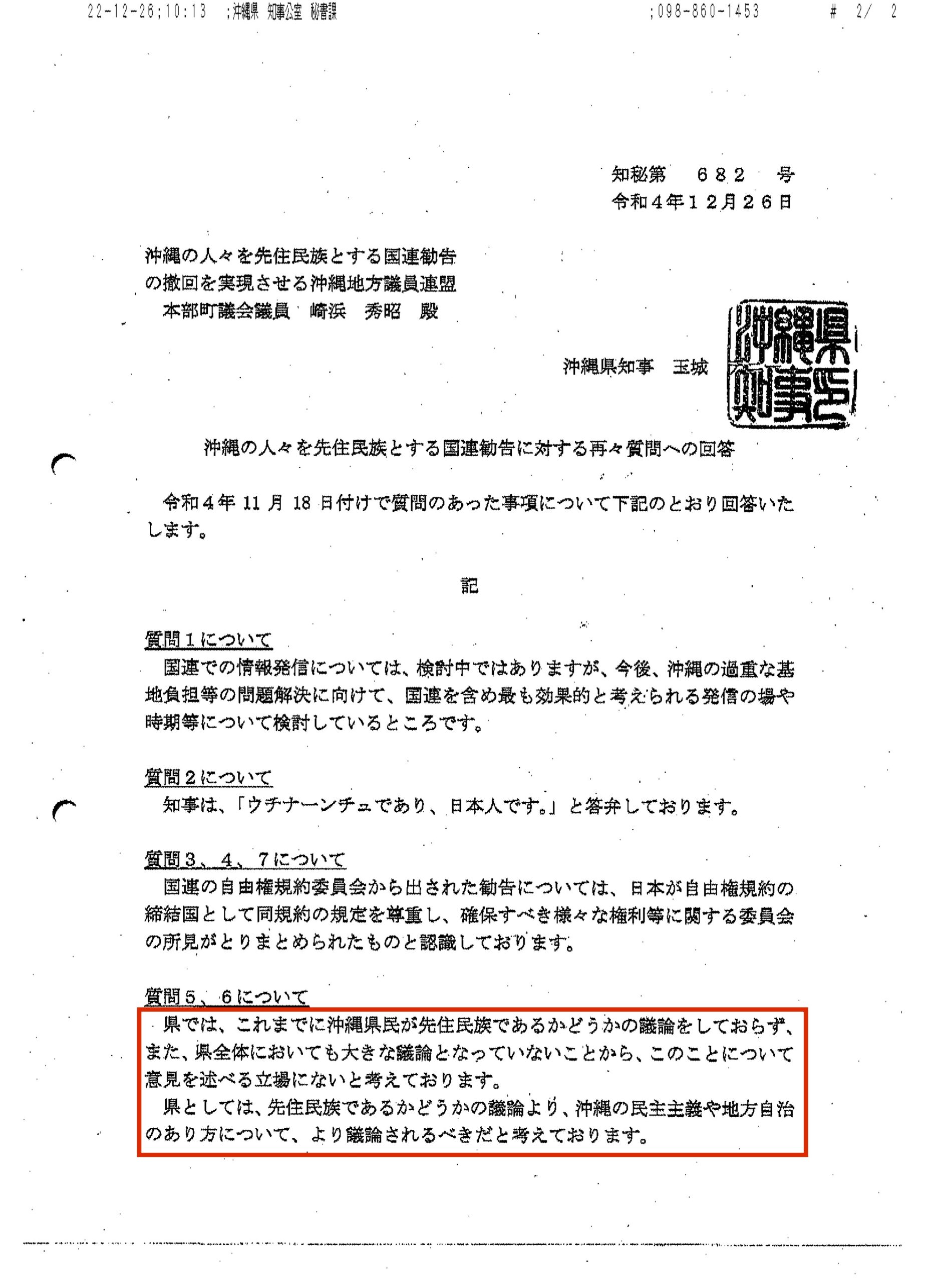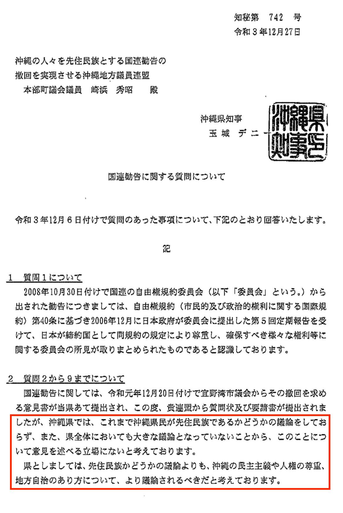 しかし、沖縄県は翁長知事の時代から、沖縄の人が先住民族か日本人なのか明言する答弁を避け、国連先住民族勧告を否定することも避け続けてきました。