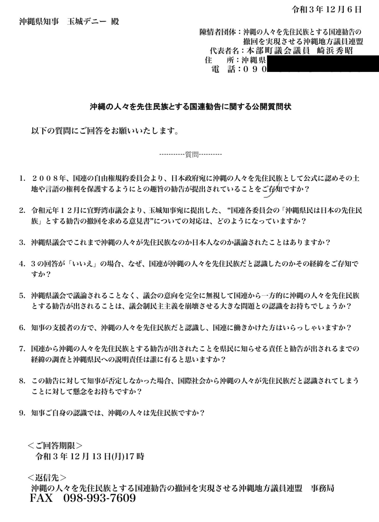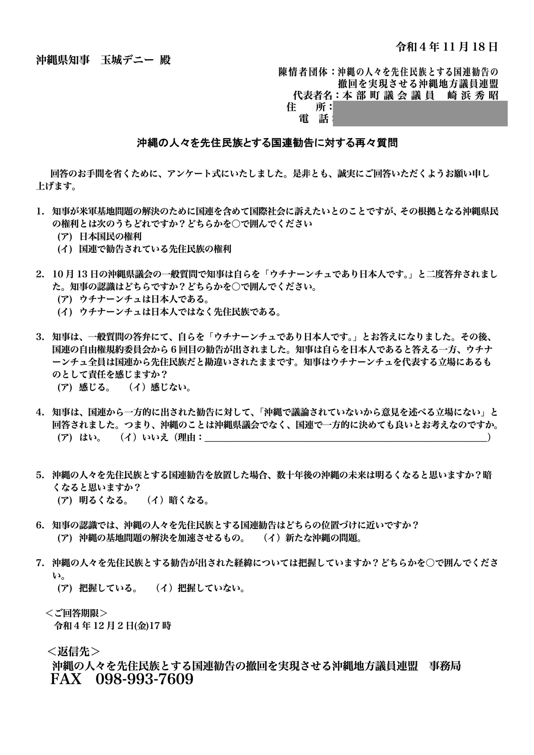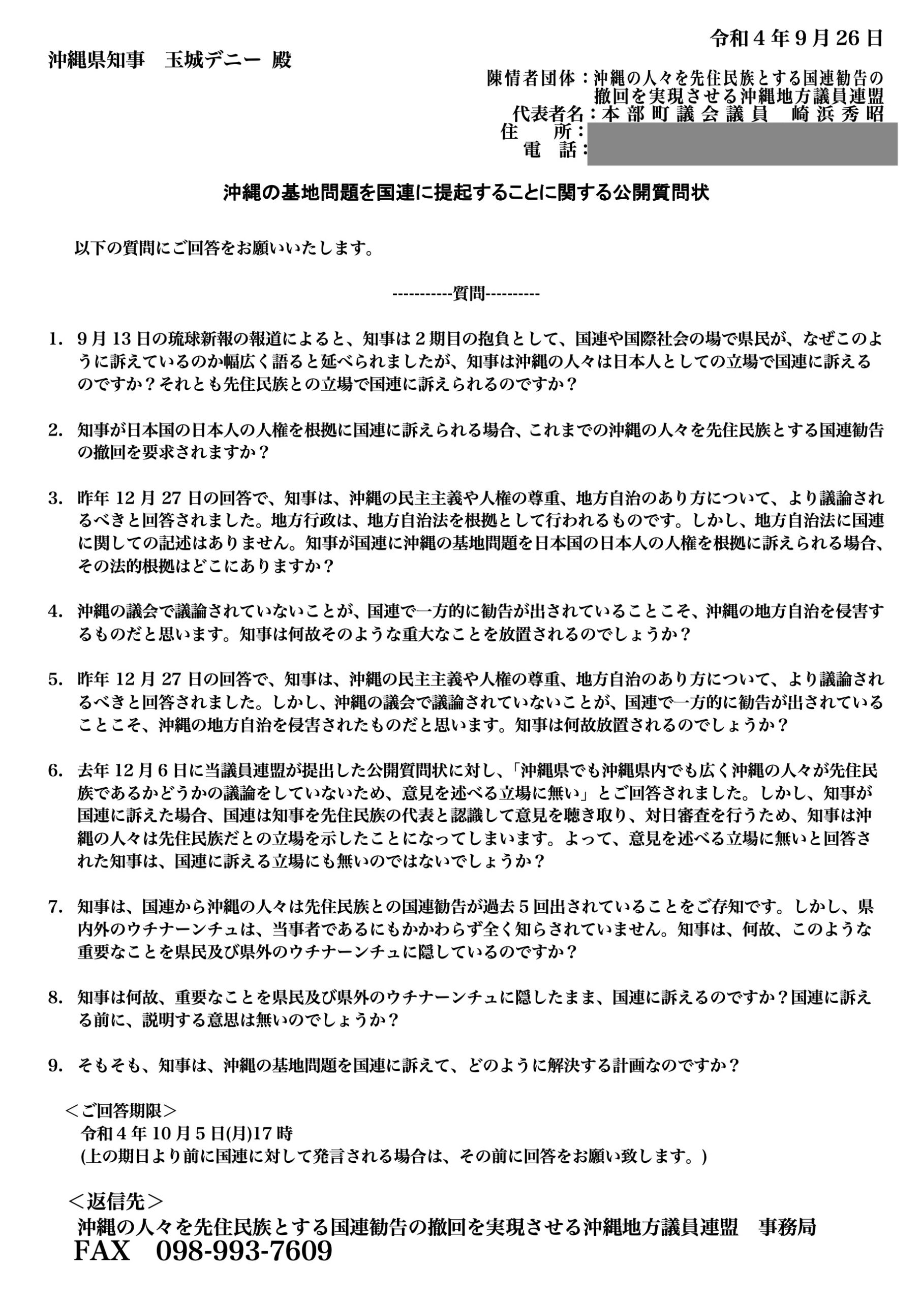 玉城知事に国連に基地問題を訴える前に県民に対して「沖縄の人々を先住民族とする国連勧告」の説明を求める意見書9月13日の琉球新報の報道によると、知事は、二期目の抱負として、国連や国際社会の場で県民が、なぜこのように訴えているのか幅広く語ると延べられました。これまで、日本政府がだめなら国連に訴えるという程度しか、我が議会でも認識しておりませんでしたが、今回、国連から日本政府に私たち沖縄の人々が先住民族と公式に認め保護せよとの勧告が2008年より5回出されていることを初めて知り、若干の不安を覚えた次第です。それは、「沖縄の人々を先住民族とする国連勧告の撤回を求める沖縄地方議員連盟」より、昨年12月6日に玉城知事に提出した公開質問状とその回答書を送付いただき、拝見したからです。一同、勧告の存在に耳を疑うとともに、回答書によると、玉城知事は同勧告の存在を既にご存知でしたので、更に驚いた次第です。しかし、これまで玉城知事から、国連という言葉を聞いたことはありますが、私達県民に沖縄の人々を先住民族とする国連勧告の存在を説明されたことは一度もないと存じあげております。私たち沖縄の地方議員としては、国連が、そのような判断をしたことを信じることができず、国連で何が起きているのかも、皆目検討がつかない状況です。特に、沖縄の問題であるにも関わらず、議会で議論されずに事が運ばれていることには、極めて違和感や不安を覚えるものです。よって、一旦、国連に対する活動を保留にしていただき、事前に国連で何が起きているのか以下の要領で、説明責任を果たしていただきたく存じます。1. 国連に沖縄の基地問題を訴える前に、国連各委員会及び、沖縄県民及び県外のウチナーンチュ及び国連の各委員会に対して、正確な情報を提供・説明し、これまでの双方の認識のギャップを解消すること。それができるまでは国連に何も訴えないこと。(ア) 国連に対して、「沖縄のほとんどの人は先住民族の定義を知らず、その認識も持っておらず、先住民族の権利の獲得について議論すらされていない」ということを伝えること。(イ) 沖縄県民及び、県外のウチナーンチュに対して、国連の自由権規約委員会及び人種差別撤廃委員会より、日本政府に対して先住民族として認めその権利を保護するべきとの勧告が2008年より延べ5回出されていることを伝えること。(ウ) 同勧告に対して、県内で議論されたことが無いのに、何故、国連から勧告が出されたのか調査し、県民に対して説明すること。(エ) 国連に報告する前に、その内容を沖縄県議会に諮り賛同を得ること。以上、地方自治法99条の規定により意見書を提出する。令和 (2022年)12月20 日沖縄県宮古島市議会議長宛先沖縄県知事