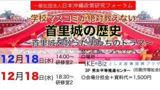首里城 【告知】12月18日「学校マスコミが絶対教えない首里城の歴史」〜首里城を救った男たちのドラマ〜 学校マスコミが絶対教えない首里城の歴史〜首里城を救った男たちのドラマ〜12月18日に以下の要領で、首里城をテーマに取り上げてセミナーを開催いたします。是非、多くの方にご参加いただきたいと願っております。学校マスコミが絶対教えない首里城の歴史... 2019.12.11 首里城